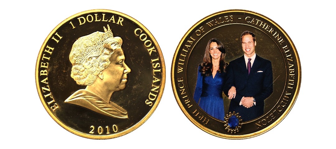 Cook Islands, Elizabeth II, Royal Engagement - William and Kate , Gold plated copper-Nickel,1 Dollar, 2010, Obv. The Effigy of Queen Elizabeth II, Lettering Around Legand "ELIZABETH II 1 DOLLAR COOK ISLANDS 2010" , Rev. " HRH PRINCE WILLIAM OF WALES -CATHERINE ELIZABETH MIDDLETON", 25.77gms, UNC.