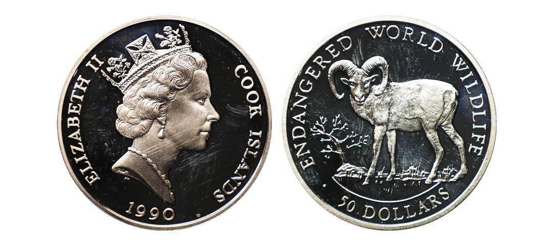 Cook Islands, Elizabeth II, Silver 50 Dollars, 19.65g, 1990, Endangered World Wildlife Series - Bighorn Sheep, obv. Effigy of queen Elizabeth II facing left, date below; rev. Bighorn sheep, denomination below. Proof.