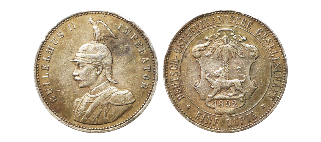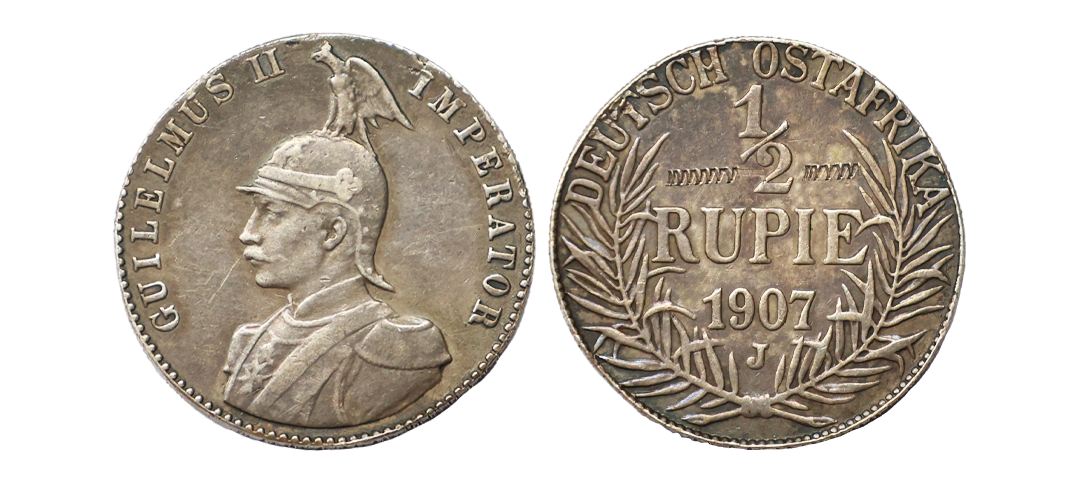 German East Africa, Wilhelm II (1888-1918 AD), Silver Rupie, 11.65 gms, AD 1911, Obv. Helmeted half-length figure in uniform facing left, Lettering: GUILELMUS II IMPERATOR, Rev. Value within palm branches, Lettering: DEUTSCH OSTAFRIKA ½ RUPIE 1911 J Translation: German East Africa, KM # 10, Schön # 12, very fine, very scarce.