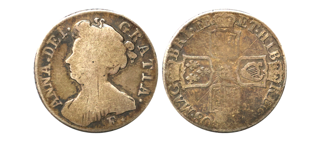 United Kingdom, Queen Anne 2nd bust, Silver 1 Shilling, 1708, Obv. Second draped bust of Queen Anne left, legend around "ANNA • DEI • GRATIA • (Translation: Anne by the Grace of God)", Rev. Crowned cruciform shields with central Garter star, divided date above. (Note: post-Union halved shields), Reeded Edge, The E and E* mintmarks indicate that the coin was minted in Edinburgh, Scotland,1.43grams, Fine.