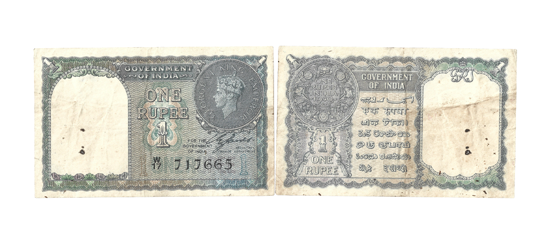 British India, George VI, 1 rupee, 1940, signed by C.E. Jones, without inset, serial no.: V68 591541 in black, J&R 4.1.1A. Exceptional paper quality, Graded as 63 Uncirculated by PMG, Spindle Hole at Issue, Seal Marks, Very scarce.