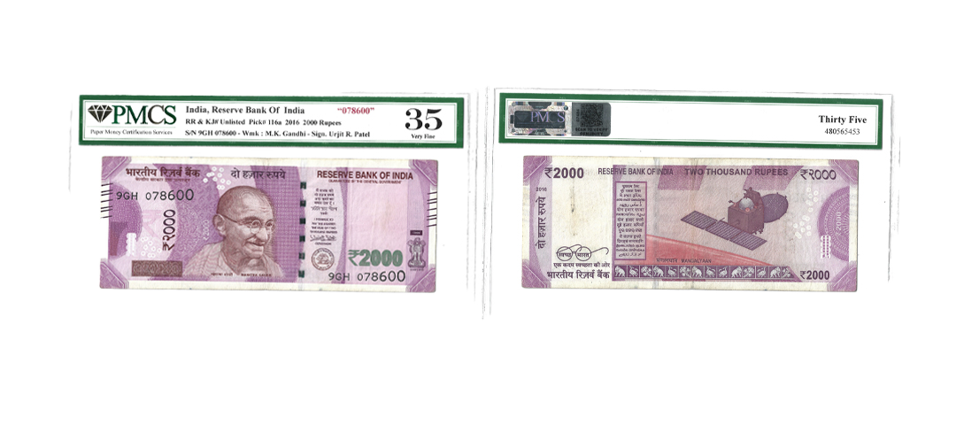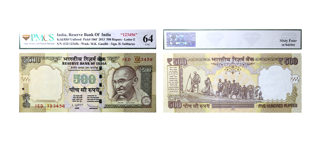 100 Rupees, 2014, Fancy Number, Old Gandhi Series, Signed by Raghuram G. Rajan, Inset L, Serial No. 3FP 111111, PMCS Graded 58 AUNC, Stains, Very Rare.