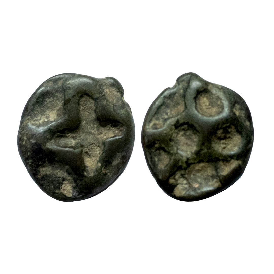 Mauryan Period, Central India, Square Cast Copper, 1.58Grms, Obv: Six arched hill, Rev: Tree-in-railing. Unlisted in Pieper. Very Fine.