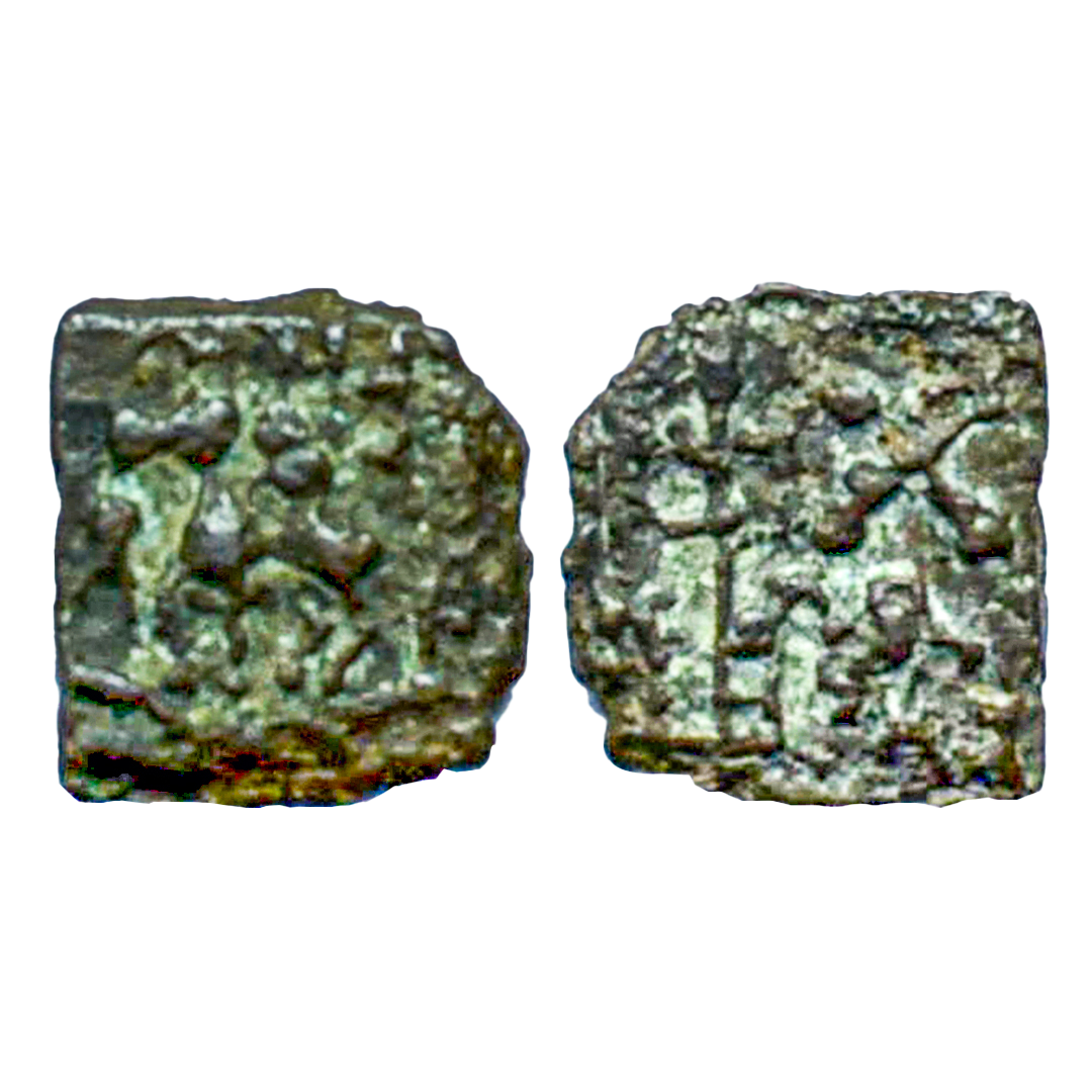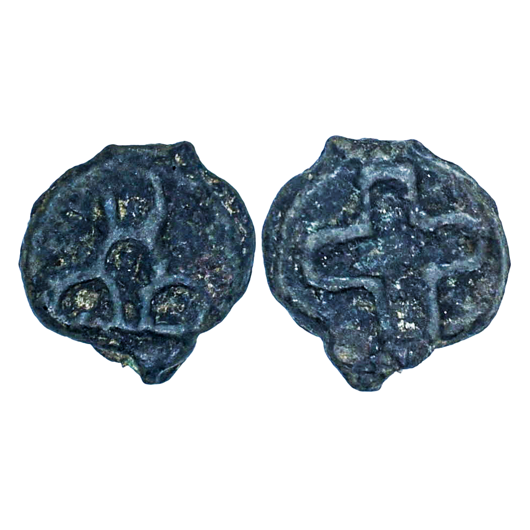 Mauryan Period, Deccan Region, Cast Copper, 2.05Grms, Obv: Open hollow-cross, Rev: Three arched hillabove crescent. (Pieper # 375).Very Fine.