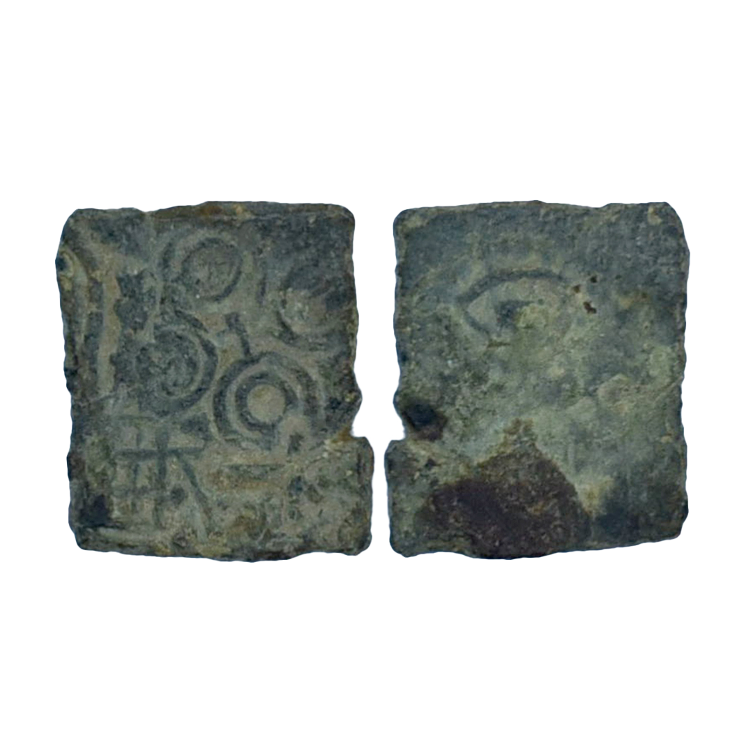 Post-Mauryan, Kaushambi Region, Uninscribed type, Cast Copper, 1.38Grms, Obv: Lanki bull walking to left side, front of inverted taurine and above four orb ujjaini symbol, Rev: Tree-in-railing with four compartments, four orbed ujjaini and taurines symbol. Very Fine.