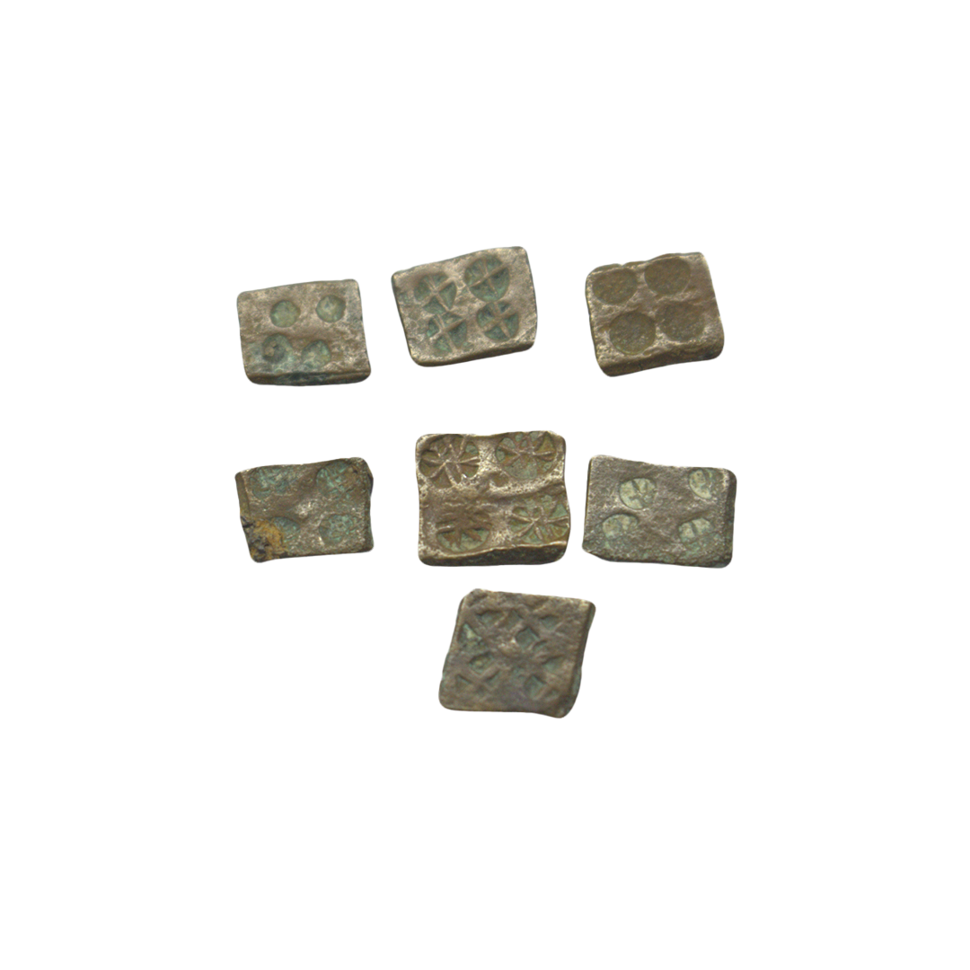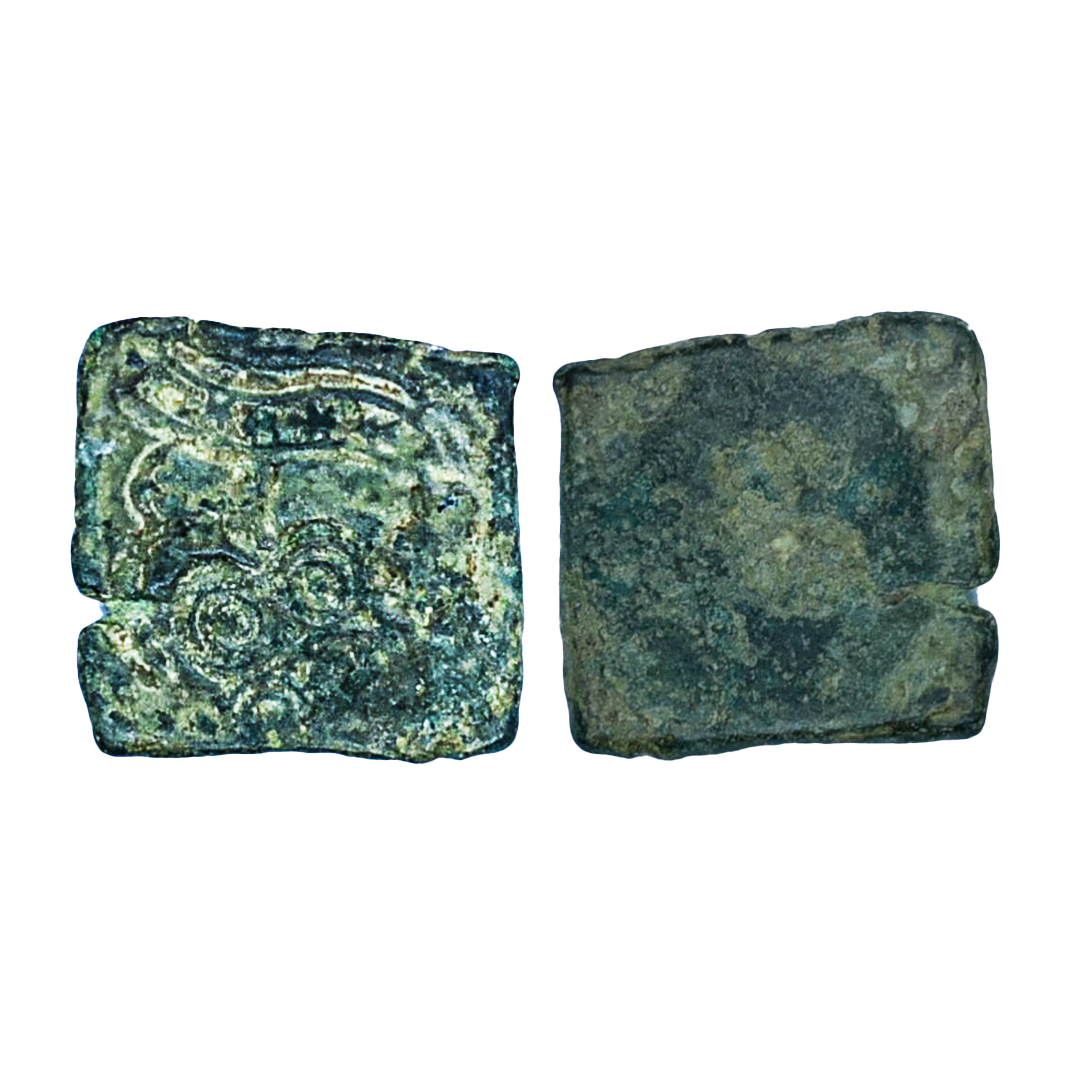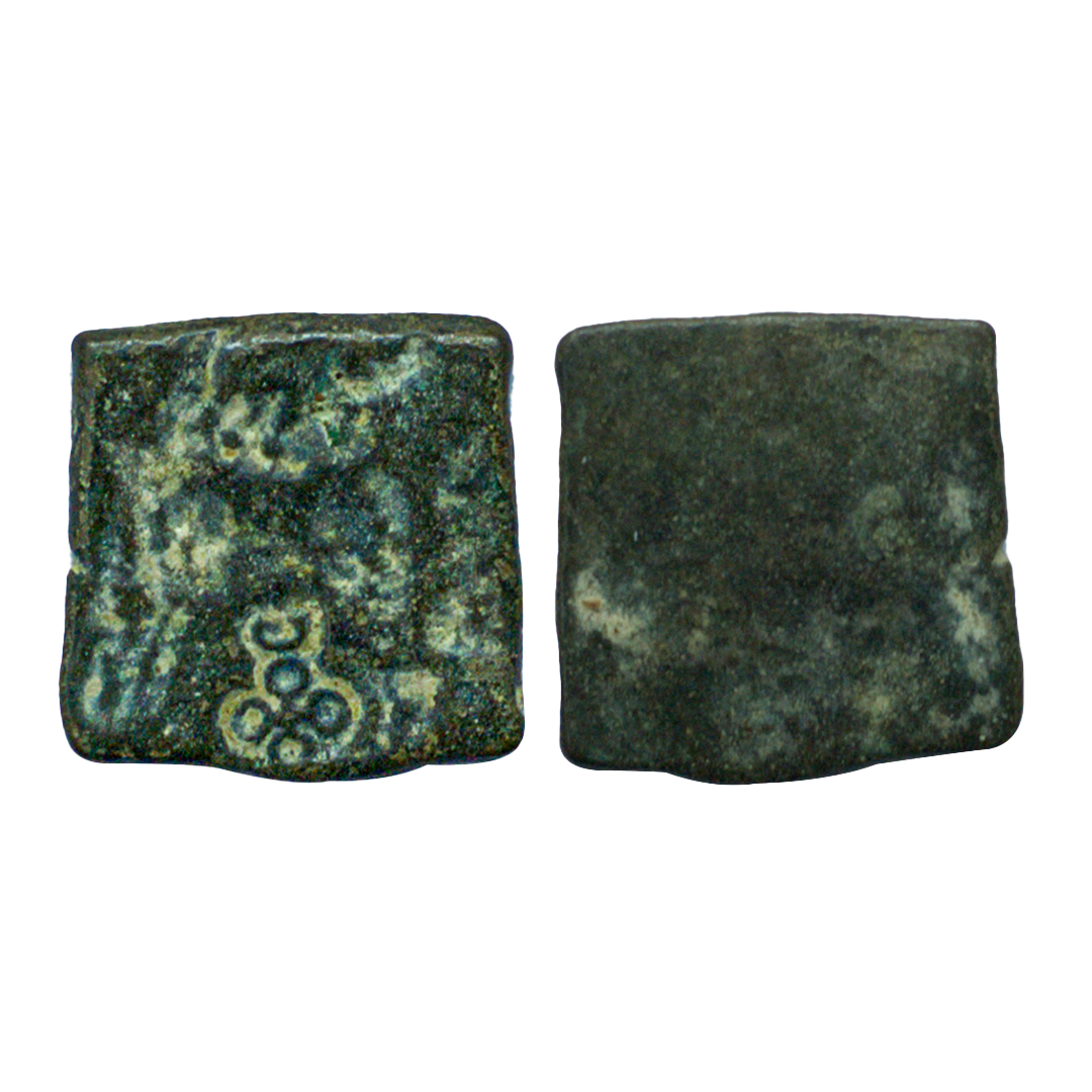 Punch Marked, Mauryan Period, Malwa Region, Copper Karshapana, 1.59Grms, Five symbol type, Obv: Sun, six armed, like a crescent, Mahakal and traces of fifth symbol, Rev: Blank. (Pieper # 290).Fine.
