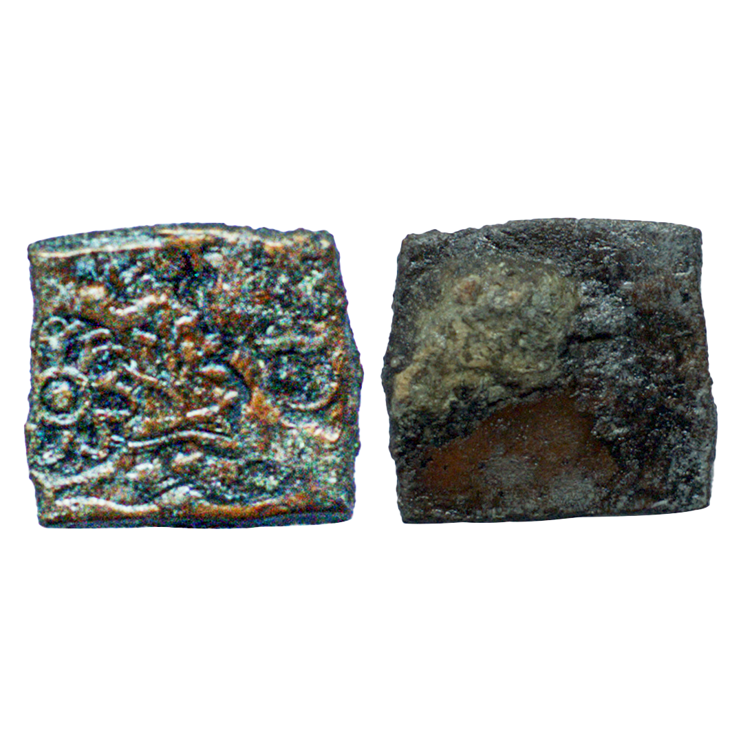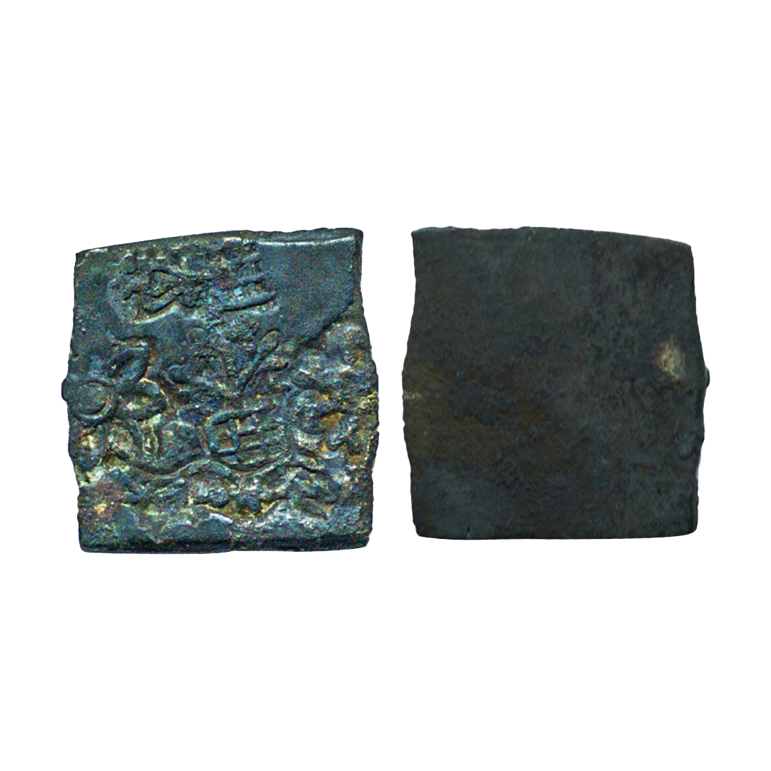 Punch Marked, Post-Mauryan, Vidisha Region, Uninscribed type, Copper Karshapana, 6.58Grms, Four symbol type, Obv: Elephant, bull, four orbed ujjiaini symbol and river with fishes, Rev: Blank. (Pieper # 877).Fine.