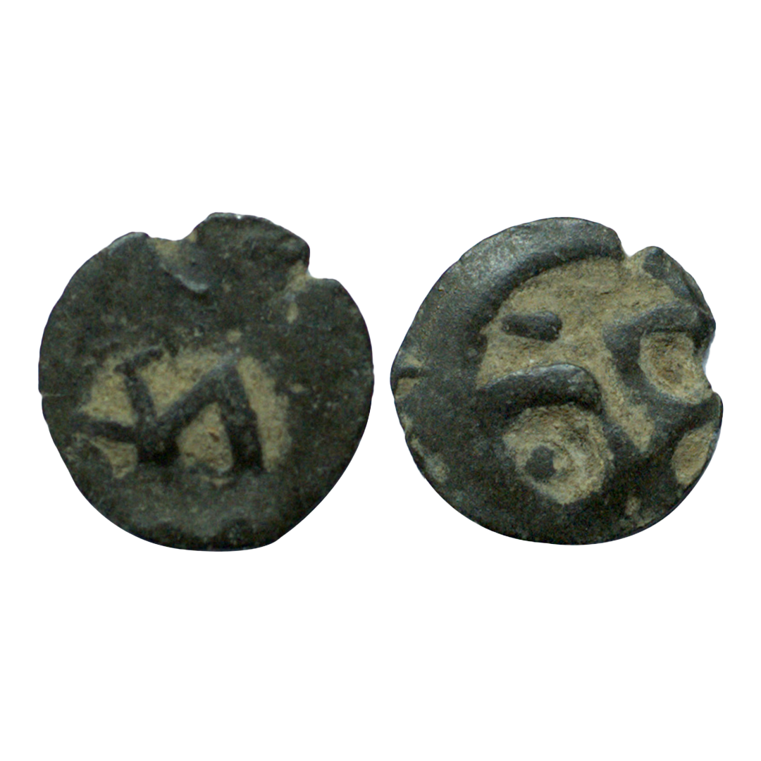Post-Mauryan, Eastern Malwa, Vidisha Region, Copper Unit, 1.90Grms Obv: Tree-in-railing with four compartments, three arched hill and below river symbol with fish and taurine, Rev: Four nandipadasymbol. Unlisted in Pieper. Fine.
