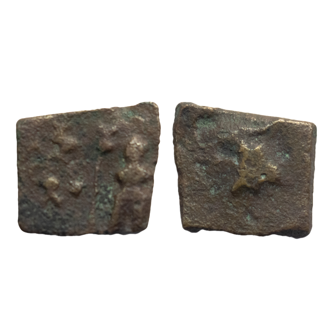 Ancient India, Post Mauryan, Saurashtra region, Uninscribed Frog type, Copper Unit, 2.25Grms, Obv: Human figure standing with spear besides a six arms symbol, Rev: Two turtle with a taurine on each end. (Pieper # 503).