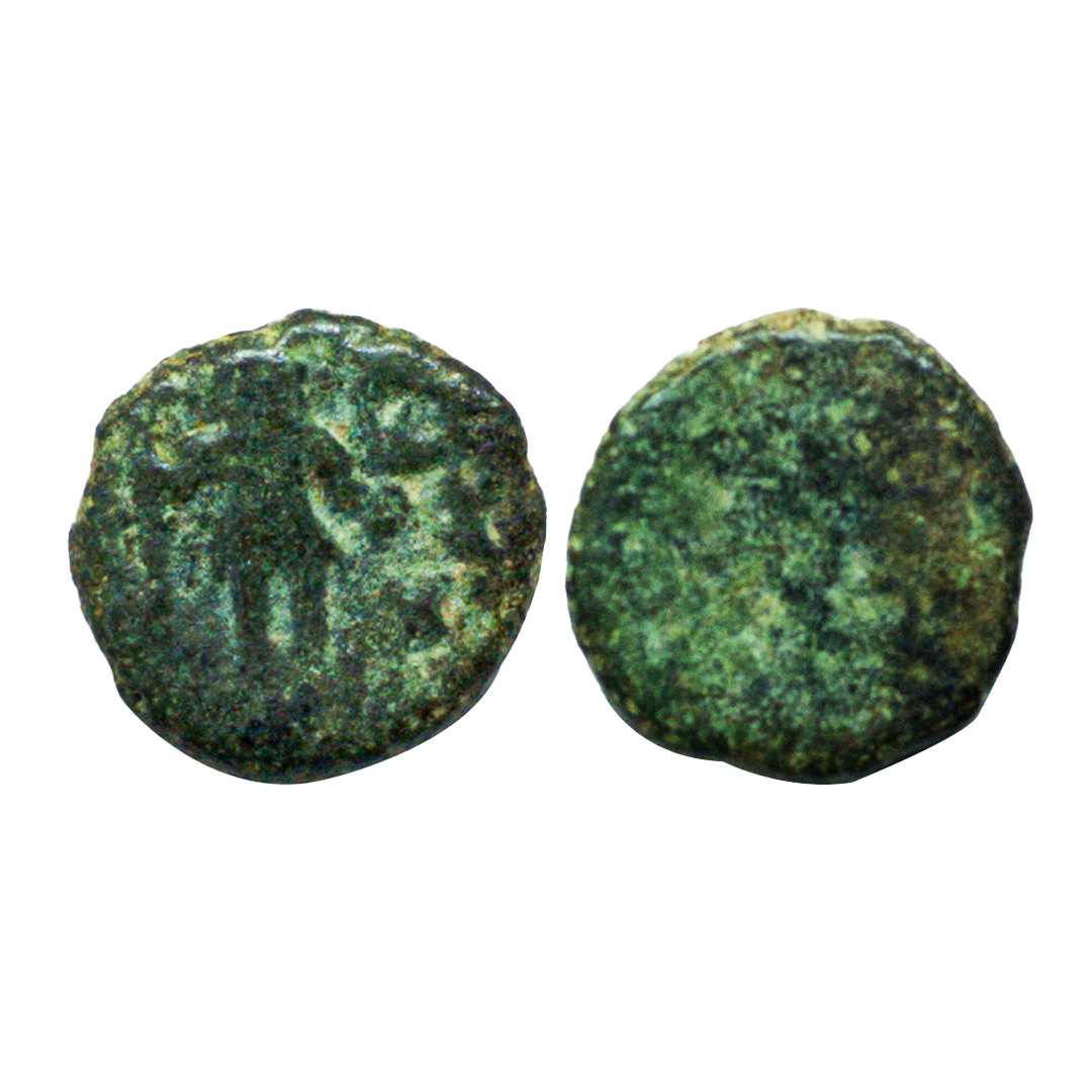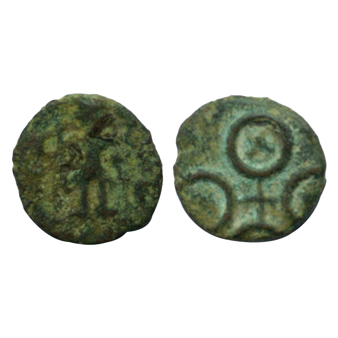 Post Mauryan, Ujjaini Region, Uninscribed, Copper Unit, 2.11Grms, Obv: Mahakal standing facing, holding spear on left hand and kamandalu on right hand, tree in railing left side, six armed symbol on right side with fish tank, Rev: Double orb ujjaini symbol. (Pieper # 628 type).Fine.