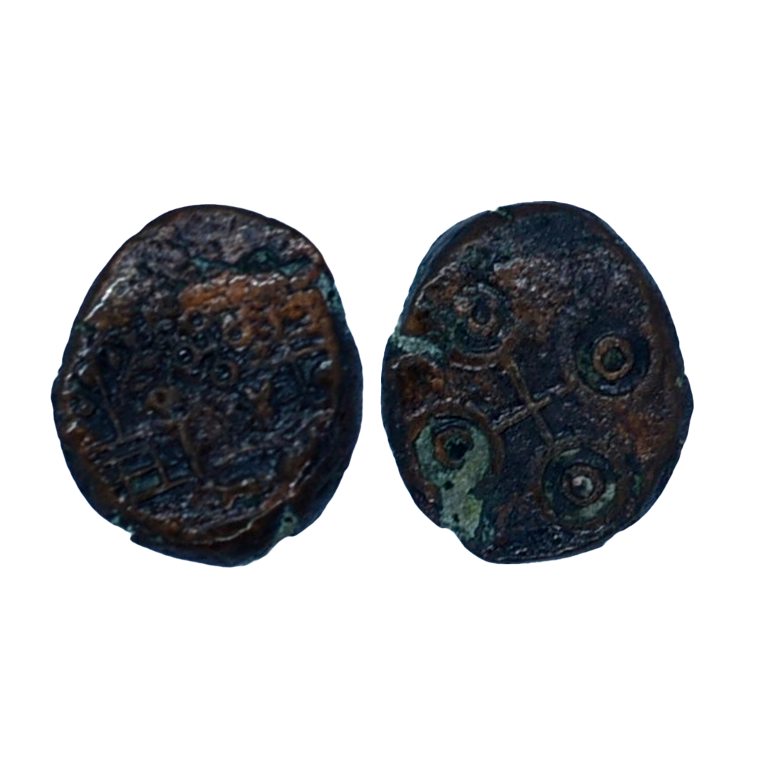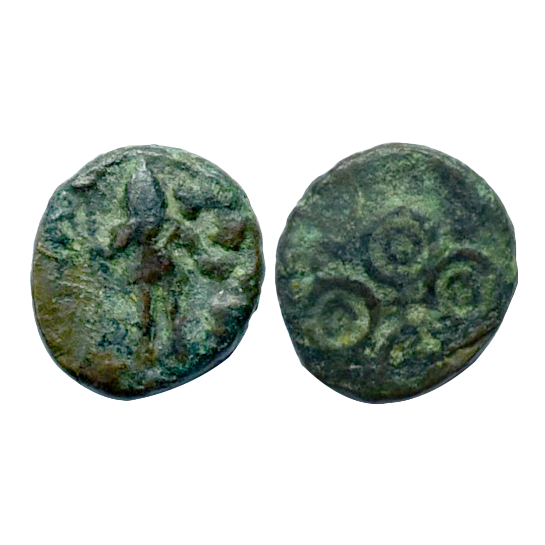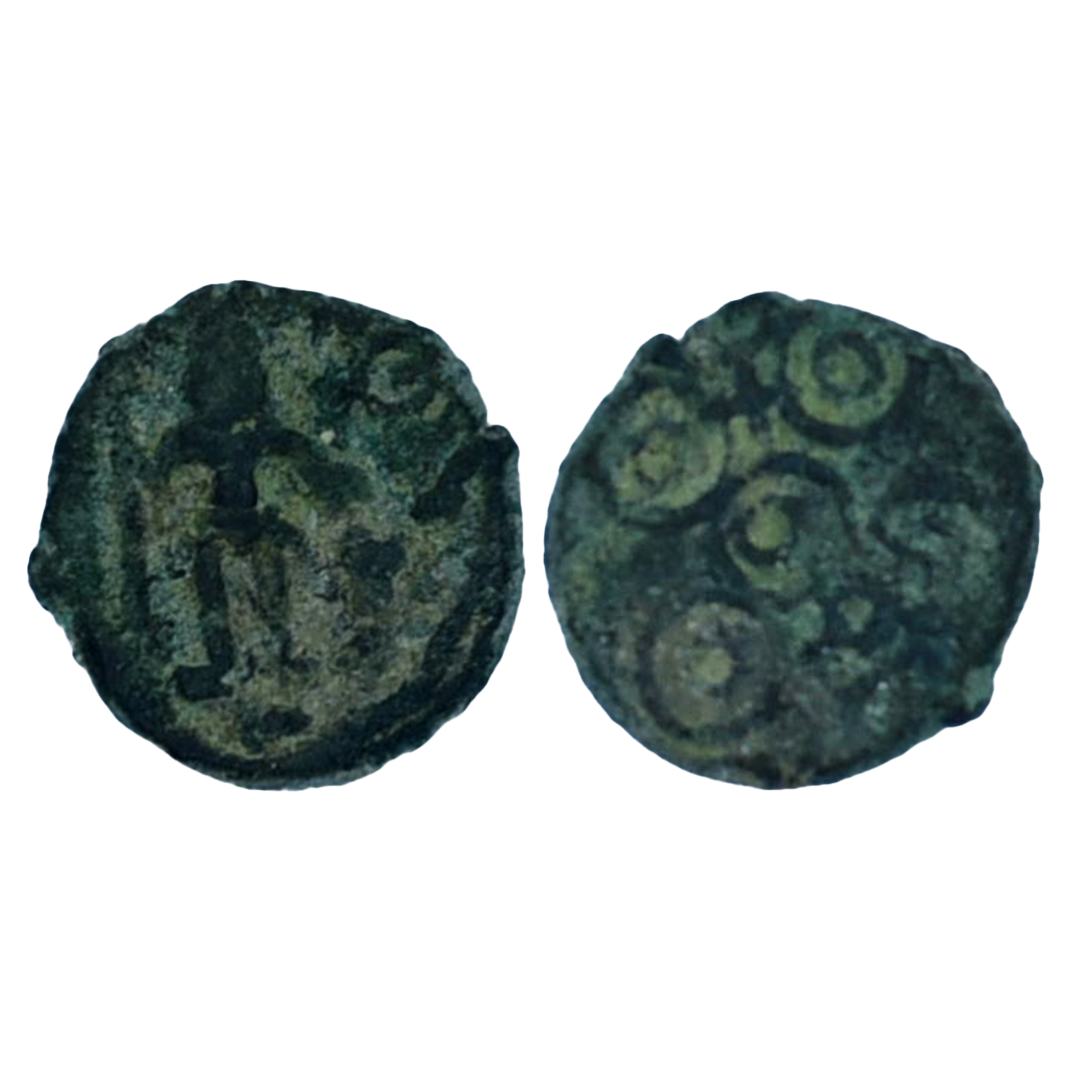 Post-Mauryan, Ujjaini Region, Uninscribed type, Copper Unit, 3.68Grms, Obv: Mahakal standing holding stick and kamandalu in hand, wheel on left field, fish tank and tree-in-railing on right side, Rev: Four orbed ujjaini swastika in each orb. (Pieper # 646).Fine.