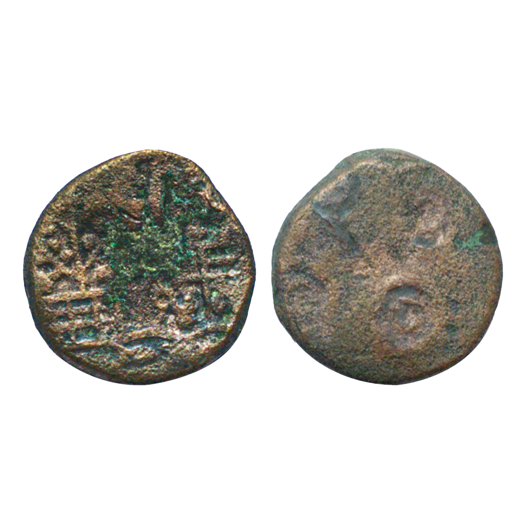 Post Mauryan, Ujjaini Region, Uninscribed, Copper Unit, 4.90Grms, Obv: Mahakal standing facing holding spear on left hand and kamandalu on right hand, six armed symbol on right field and traces of other symbol, Rev: Double orb ujjaini symbol struck twice. Fine.