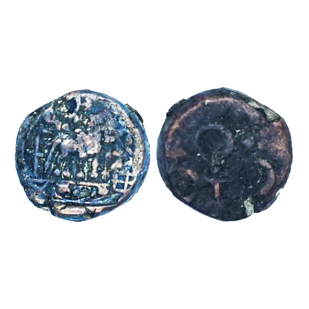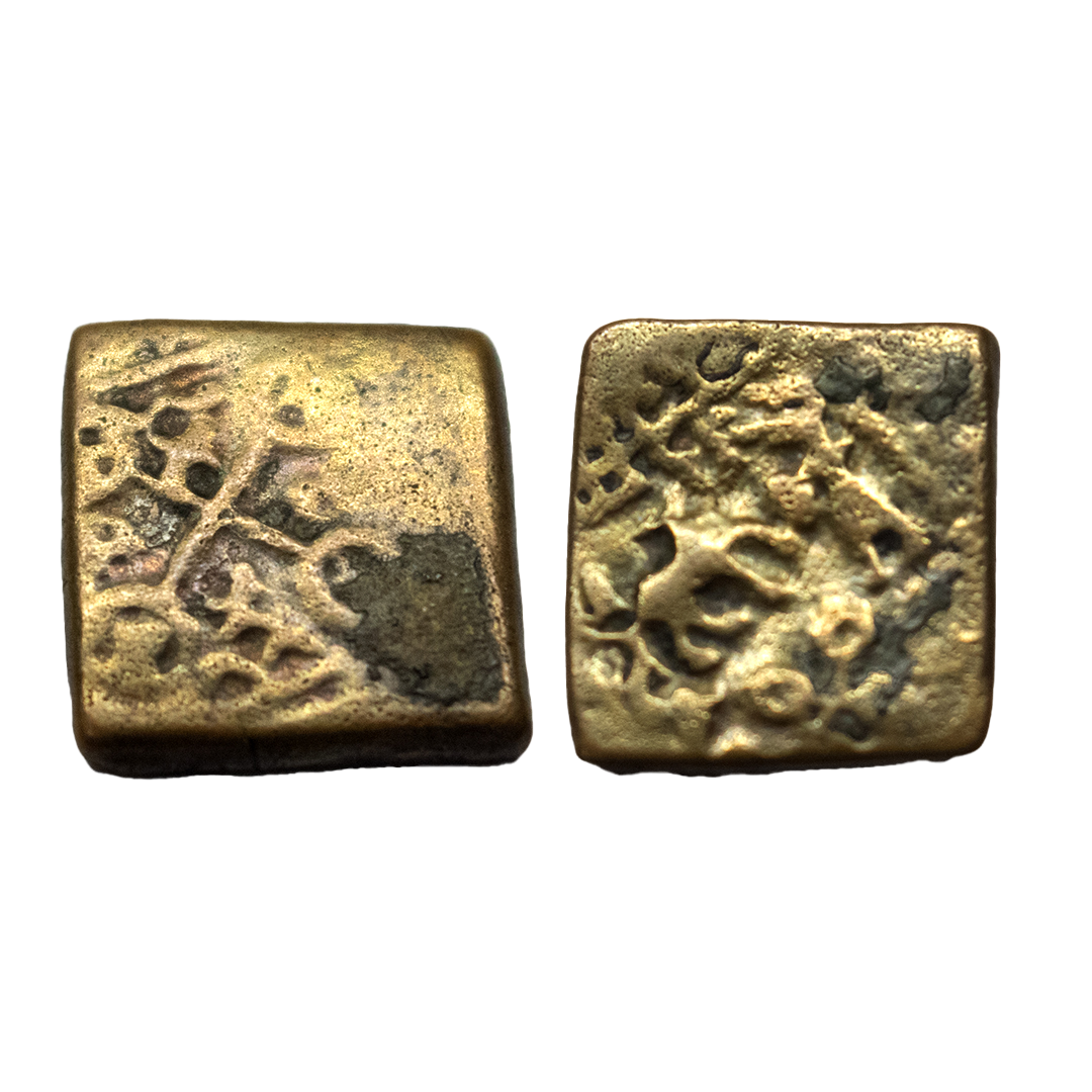 Post Mauryan, Ujjaini Region, Uninscribed, Copper Unit, 5.93Grms, Multi symbol type, Obv: Tree-in-railing, four orbed ujjaini, fish tank, indradhvaja and river with fishes symbol, Rev: Double orbed ujjaini symbol. (Pieper # 674).Fine.