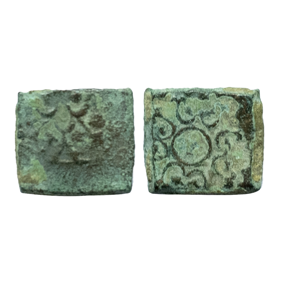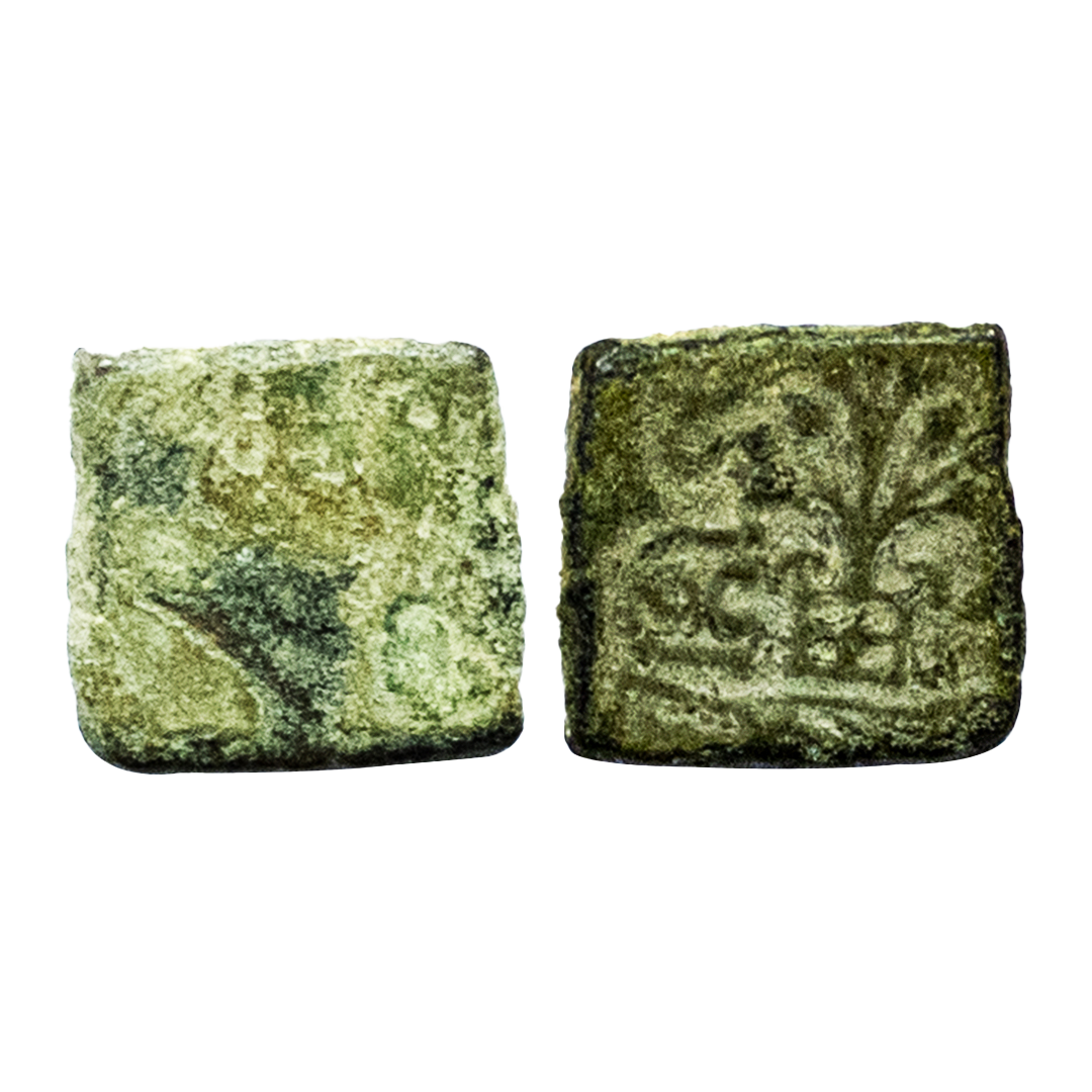 Post-Mauryan, Ujjaini Region, Uninscribed type, Copper Unit, 2.63Grms, Obv: Bull standing facing to right side, front of tree-in-railing beside swastika symbol and taurine symbol above bull, Rev: Four orbed ujjaini symbol. (Pieper # 730).Very Fine.