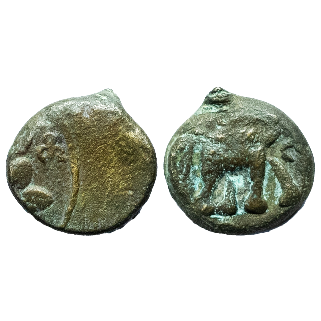 Satavahanas, KosikiputaSiriSatakani (c.50-30BC), 'Elephant' type, Newase-Paithan Region, Copper Unit, 2.18Grms, Obv: Elephant marching to right with trunk raised, around traces of Brahmi legend, Rev: Tree with large leaves in a railing. (Pieper # 2609).Fine.