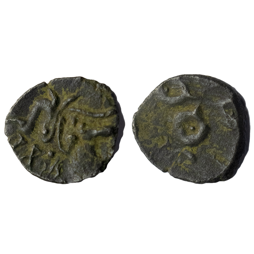 Satavahanas, KosikiputaSiriSatakani (c.50-30BC), 'Elephant' type, Newase-Paithan Region, Copper Unit, 2.18Grms, Obv: Elephant marching to right with trunk raised, around traces of Brahmi legend ‘Kochi…’, Rev: Tree with large leaves in a railing. (Pieper # 2609).Fine.