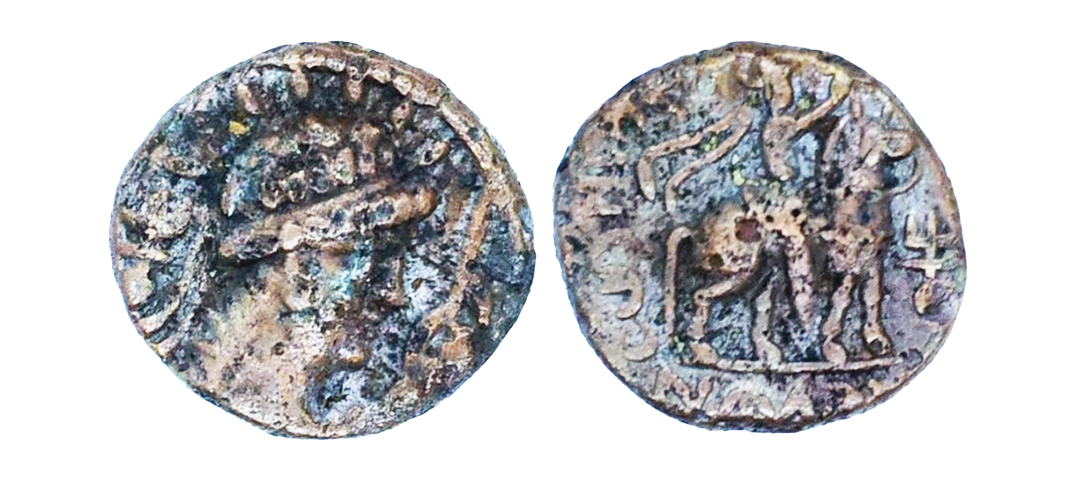 Ancient India, Kushanas, Yueh-Chi Dynasty, Sapalbizes (c. 20-1 BC), Silver Hemidrachm, 1.21Grms, Obv: Helmeted bust if king facing to right behind Greek legend ‘CAPALBIZHC’, Rev: Lion standing facing to right side with long neck, tamgha and Greek legend on both side ‘NANAIA’. (Jongeward, Cribb& Donovan # 1-2). Estimate