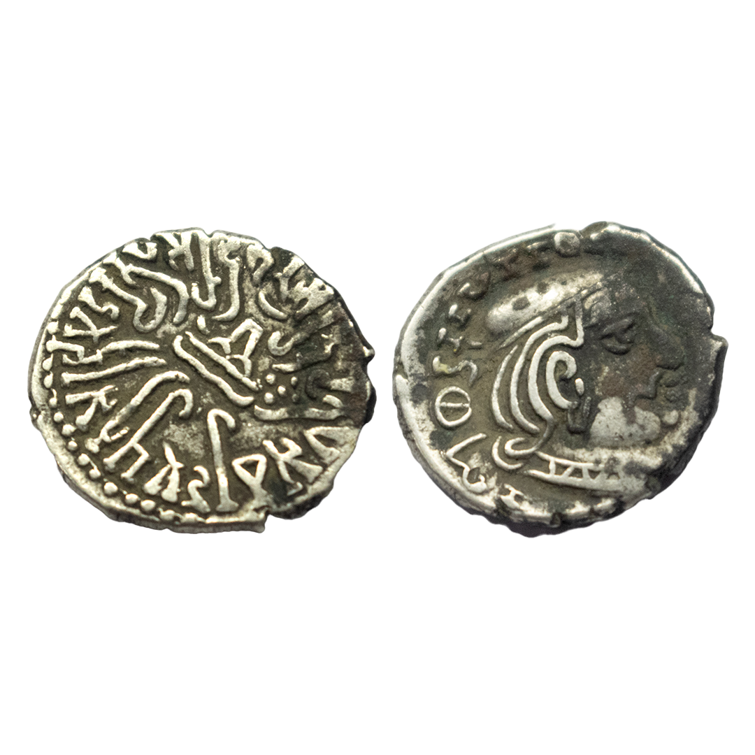 Western Kshtrapas, Kardamaka Family, Vijayasena (c. 238-239 AD), SE 170, Silver Dramma, 2.04Grms, Obv: Bust of king to right, Date in Brahmi behind bust and around Greek corrupt legend, Rev: Three arched hill (Chaitya) with crescent on top, flanked by sun and moon, wavy line below, Brahmi legend around reading ‘RajnoMahakshtrapasaDamasenasaputrasaRajno [MahakshtrapasaVija]yasenasa’. (Fishman # 3398).Very Fine+.