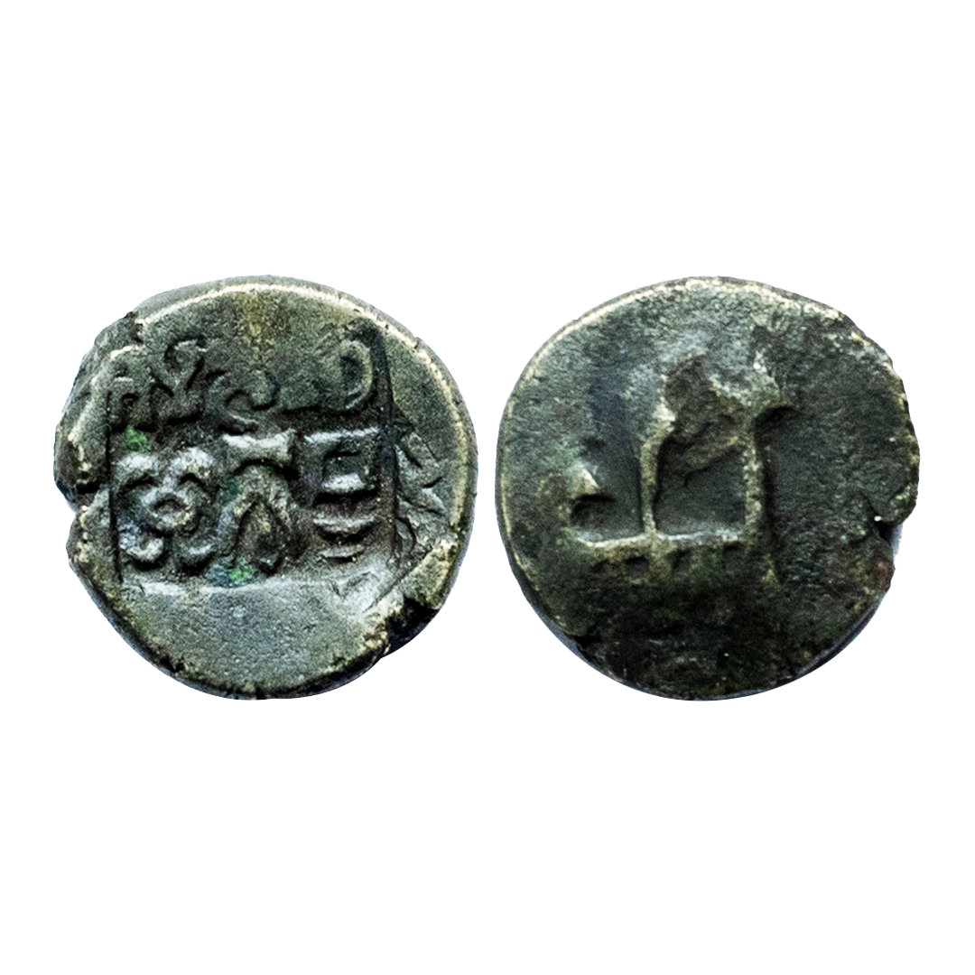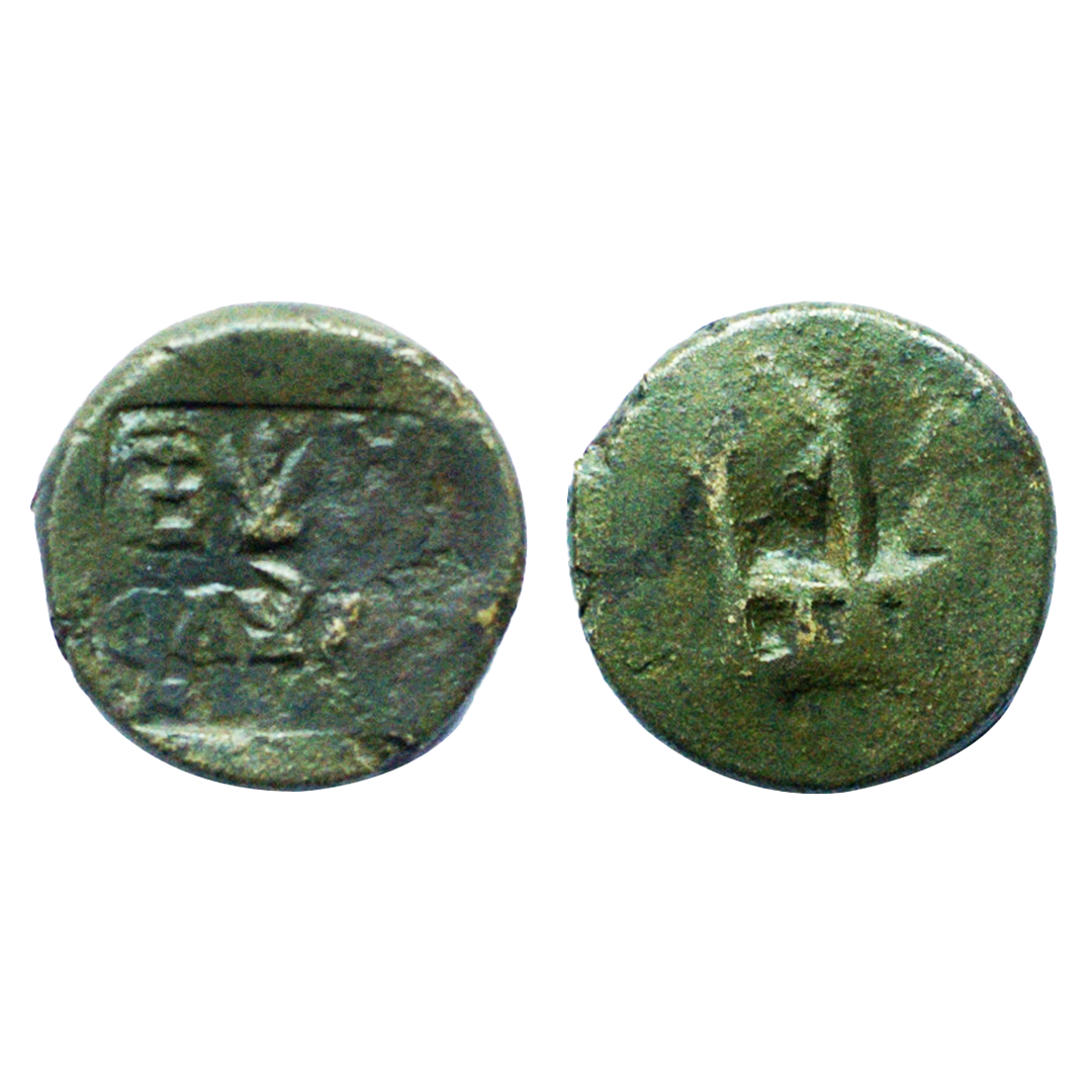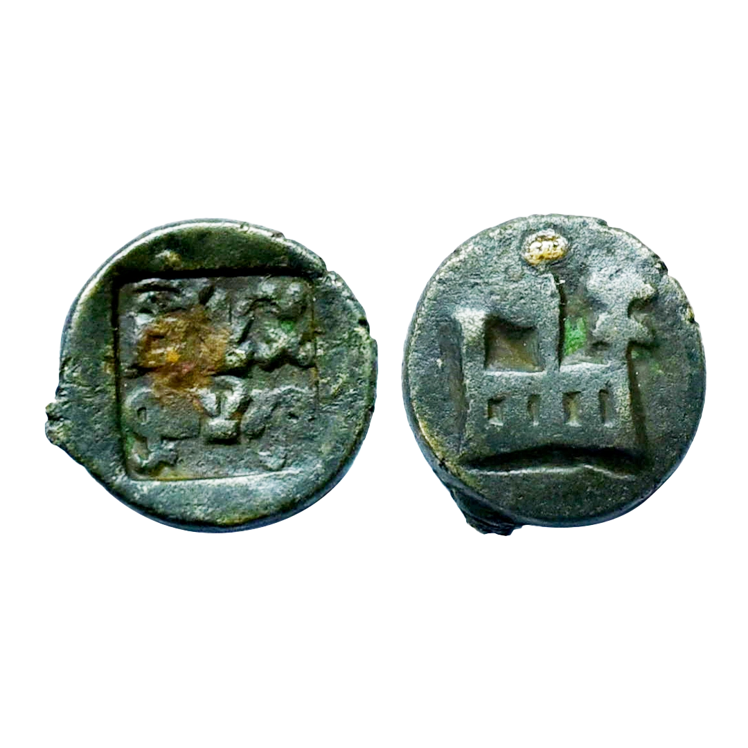 Panchalas of Ahichhatra Dynasty, King Achyuta (c. 400 AD), Copper Unit, 0.70Grms, Obv: Brahmi legend achyu, Rev: 8 spoked wheel with small dot in center. (Pieper # 1378).Fine+.