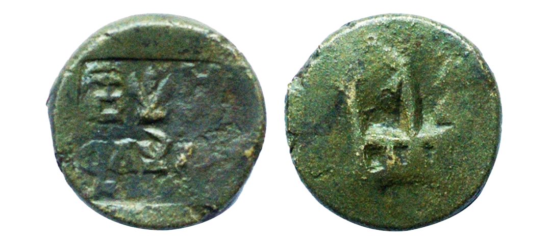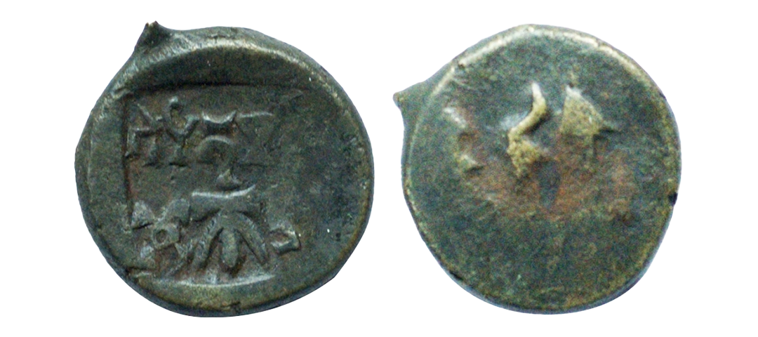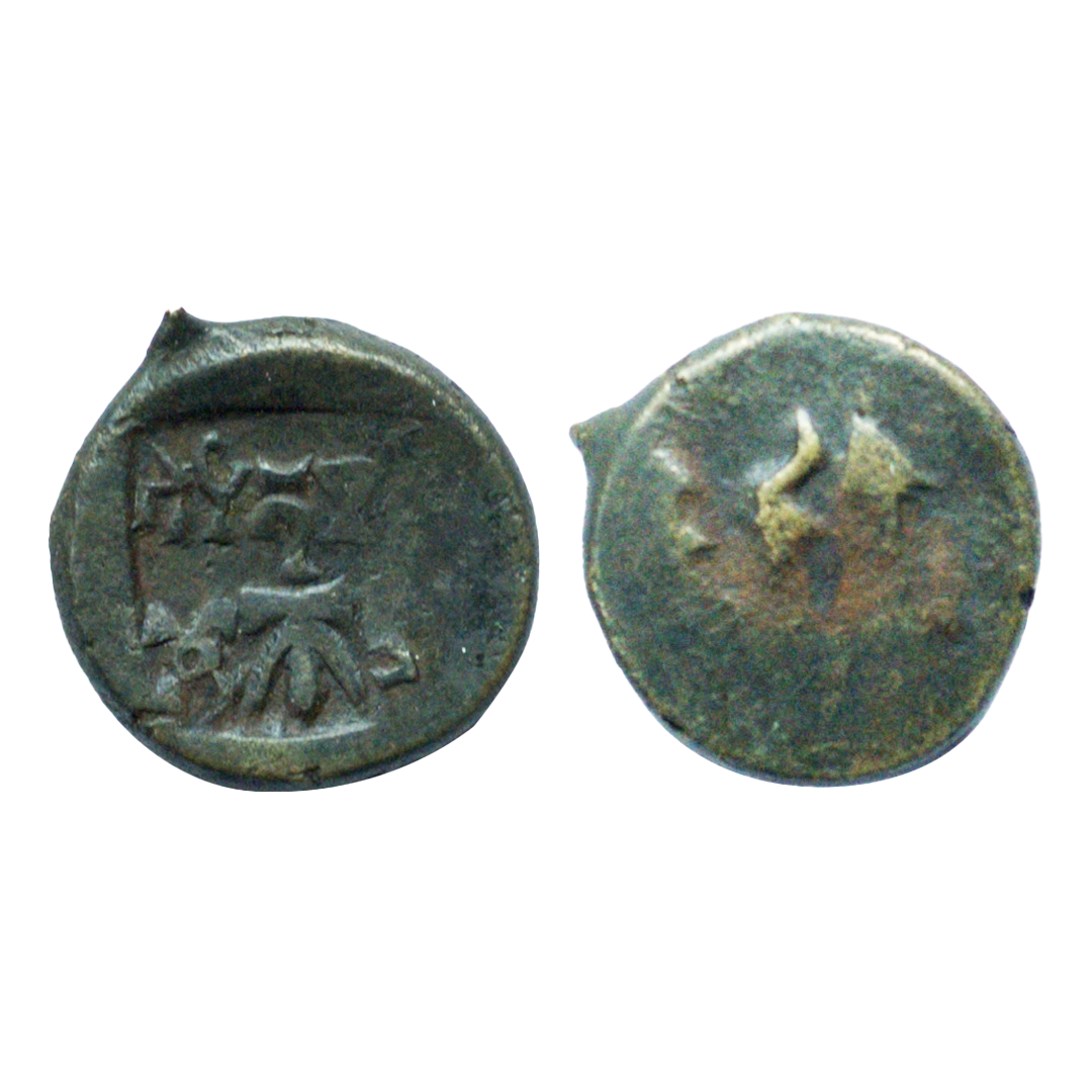 Panchalas of Ahichchhatra, Dhruvamitra, Copper Based Alloy, 5.38Grms, Obv: Royal symbol of panchala on top and below Brahmi legend ‘Dhruvamitrasa’, Rev: Curved symbol on pedestal. (Pieper # 1367).Very Fine.