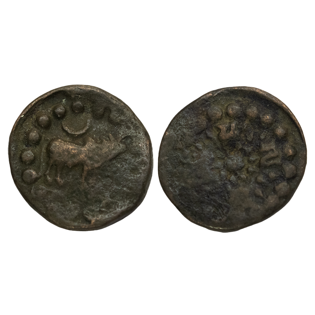 Ancient World, Nepal, Lichhavi Kingdom, Narendra Deva, Copper, 6.00Grms, Obv: Bull standing to right crescent on its back around dotted circle, Rev: Nagari legend Pashupati within dotted circle.