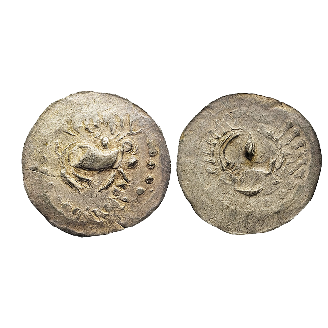 Ancient World, Ceylon Chola, Parakrambahu, Copper Massa, 3.42Grms, Obv: Standing king, lamp at left, globes at right, Rev: King seated right with left arm raised, 4-line Nagari legend below arm ‘Sri Parakram Bahu’. Fine+.