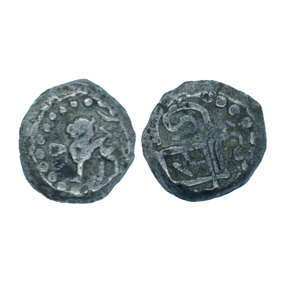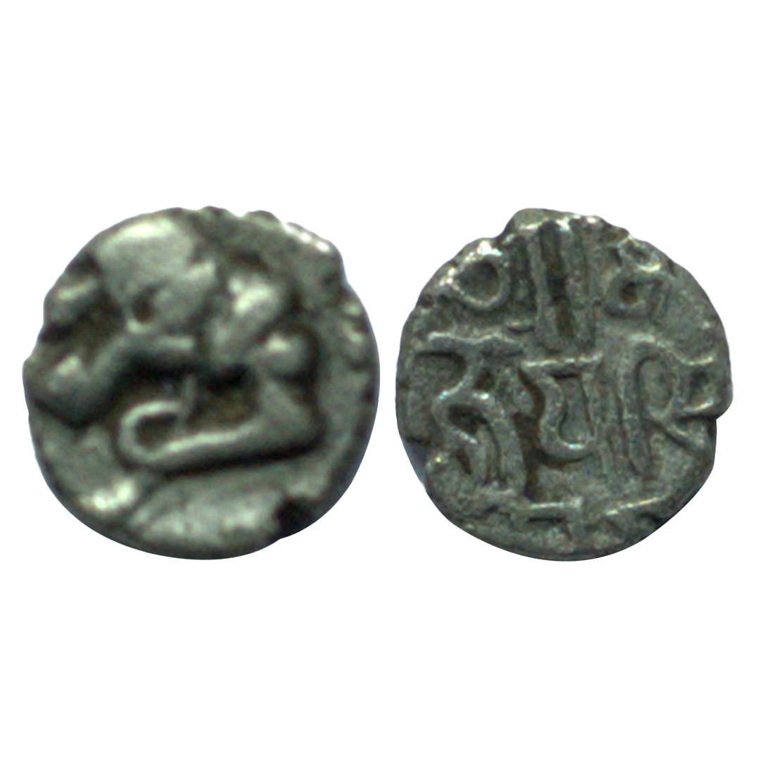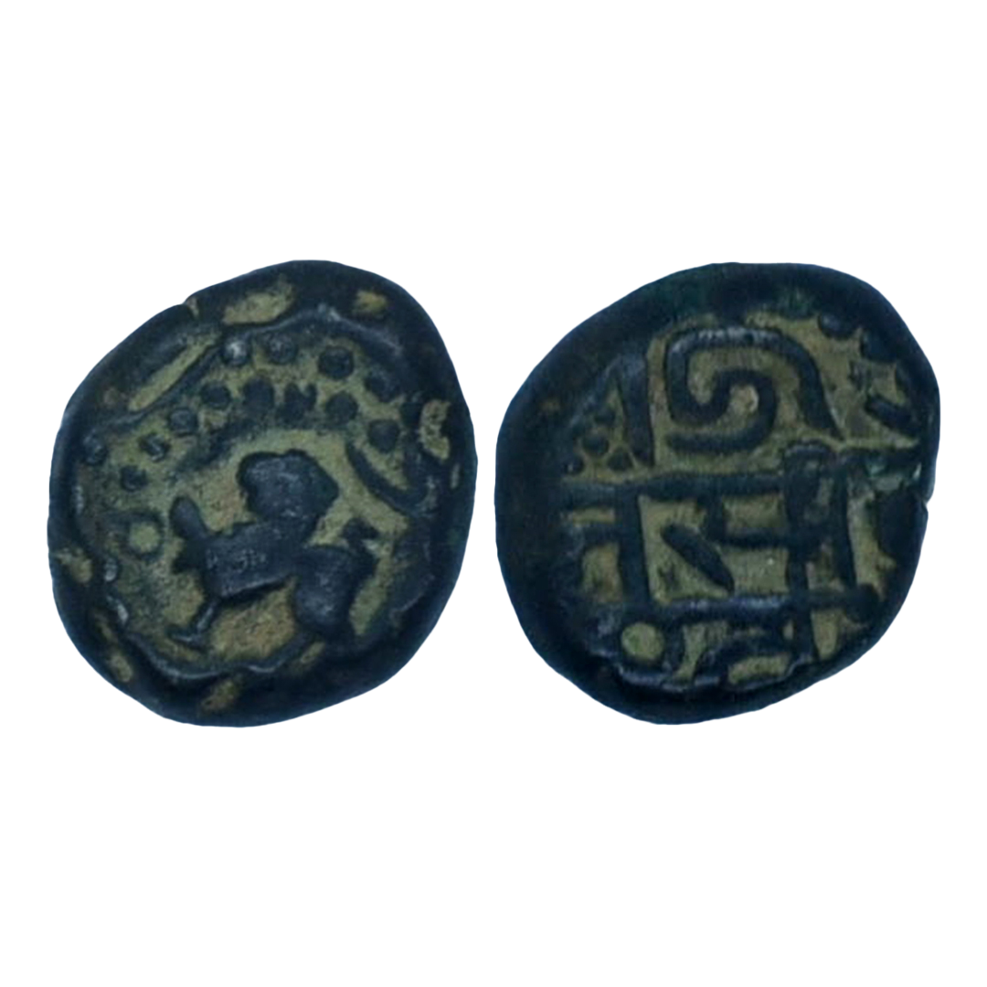 Hindu Medieval, Kashmir Rajas, Harsha Deva (c. 1089-1101 AD), Copper Drachma, 5.51Grms, Obv: Crude representation of king standing facing to left with Nagari legend on bottom, Rev: Seated goddess facing with Nagari legend spilt in two parts HarshaRa[ja]. (J. Deyell # 63). Very Fine.