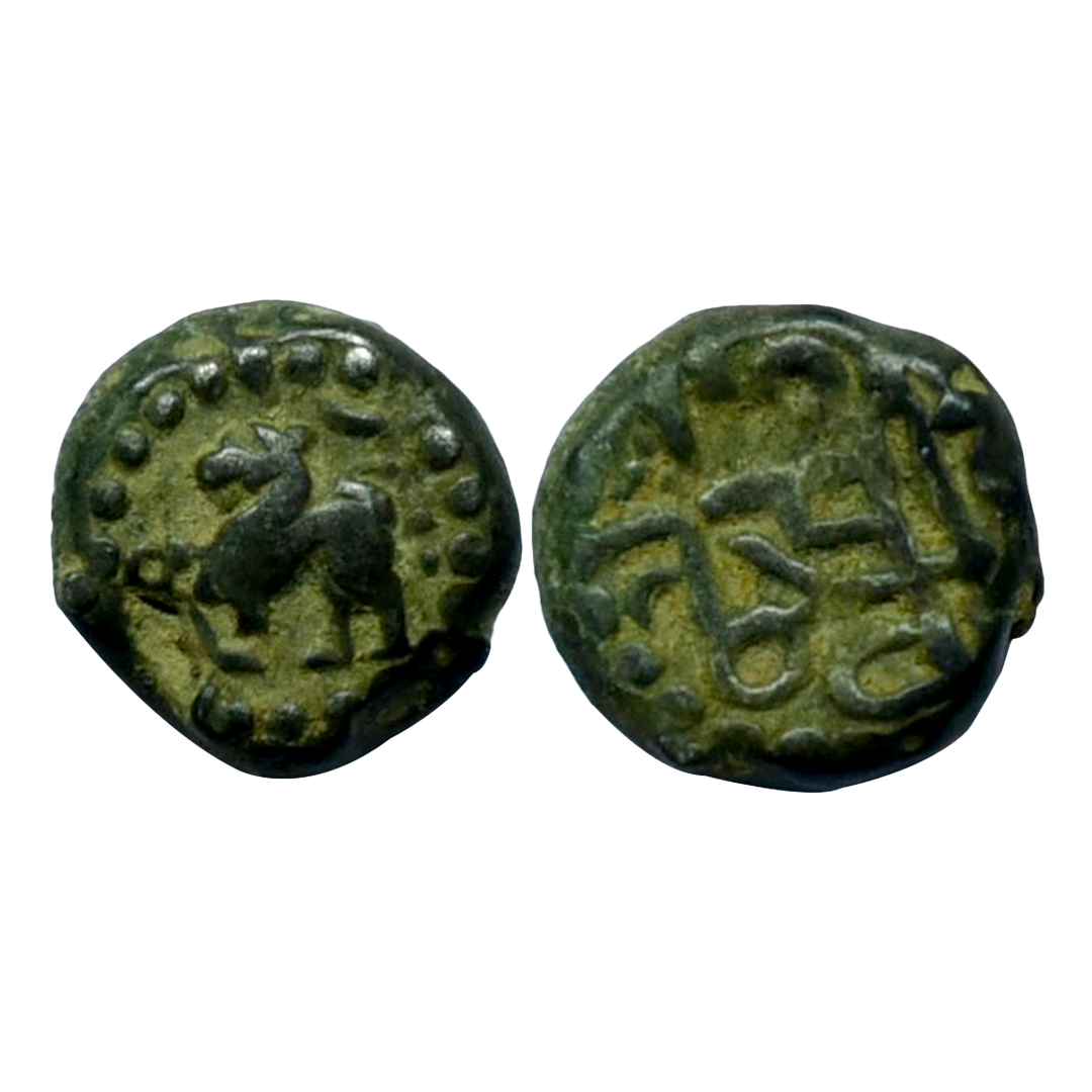 Hindu Medieval, Chowhans of Ranthambhor, Jaitra Simha (c. 1275 AD), Silver Dramma, 4.54Grms, Obv: Lion facing left with one paw upraised and around dotted border, Rev: Nagari legend in three lines 'Jaitasi Deva'. (J. Deyell # 366). Fine+.