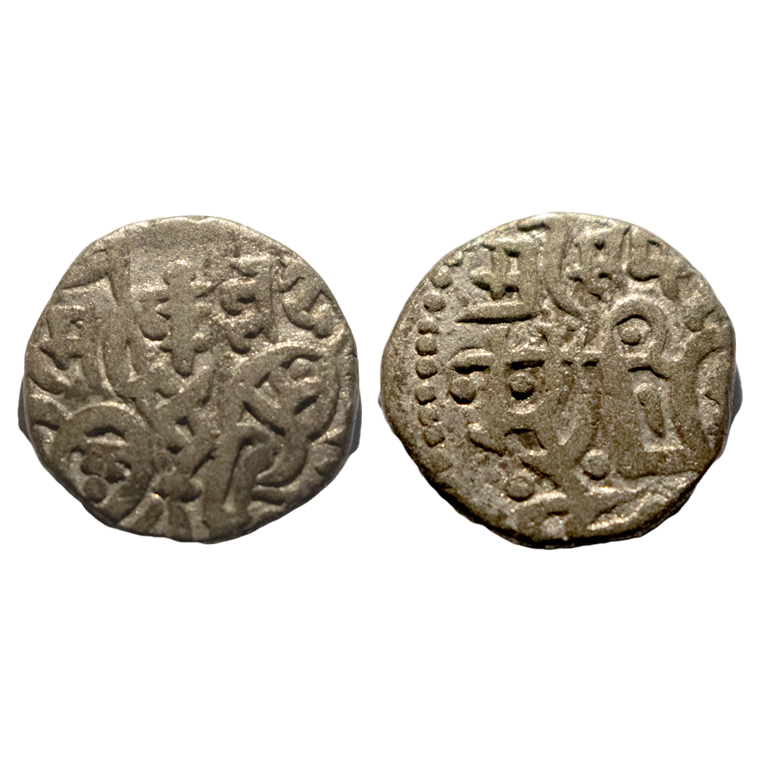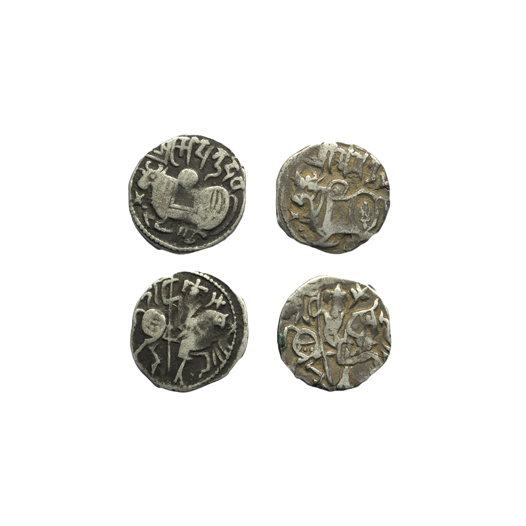 Hindu Medieval, Hindu Shahis of Kabul and Ohinda, Samantadeva (c. 850-1,000 AD), Silver Jital, 3.26Grms, Obv: Recumbent bull facing left with Sarada legend ’Sri Samantadeva', Rev: Rider on a caparisoned horse with legend 'Ha' next to the rider. (J. Deyell 44). Very Fine+.