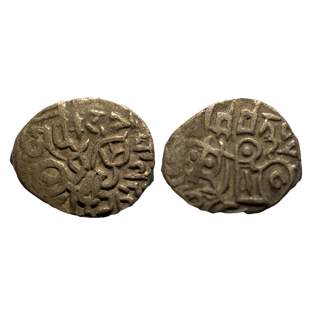 Hindu MedievalTomaras of Delhi, Sallakshana Pala (c. 1120-1130 AD), Silver Jital, 3.25g, Obv: Recumbent bull facing left with Sarada legend ’Sri Samanta deva’; Rev: Rider on a caparisoned horse with Nagari legend ’Sri sallakshanapala deva ’ next to the rider. John (J. Deyell # 184).