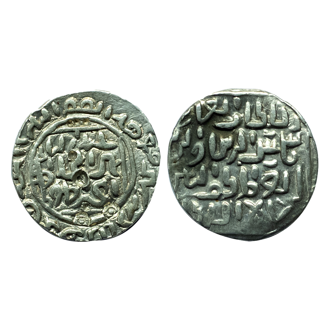 Sultans of Delhi, Khaljis, silver square tanka of Qutb al-Din Mubarak Shah (1316-1320 AD), Hadrat Dar al-Khilafa mint, G&G D261, 9.73g. Obv: Arabic legend Al-imam al a'zam khilafat rabb al-alamim qutab al-dunya wa al din abu Muzzafar Mubarak Shah. Rev: Arabic legend al-sultan ibn al sultan al-wathiq billah amir al-mu'minin, mint name and AH date in margins. Good, Very rare. Weigh Reduced due to use.