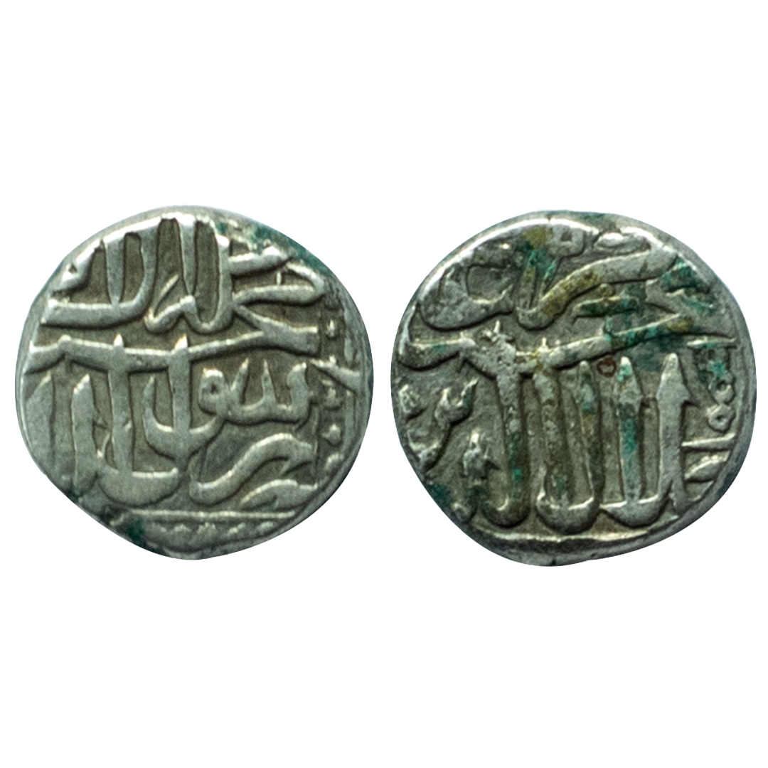 Akbar (AH 963-1014 / 1556-1605 AD), Silver Mahmudi, 5.64Grms, Mulher Mint, AH 1026, with a peacock feather symbol on rev., Mahmudi's struck by the Raja of Baglana at Mulher. (KM # 72.1).