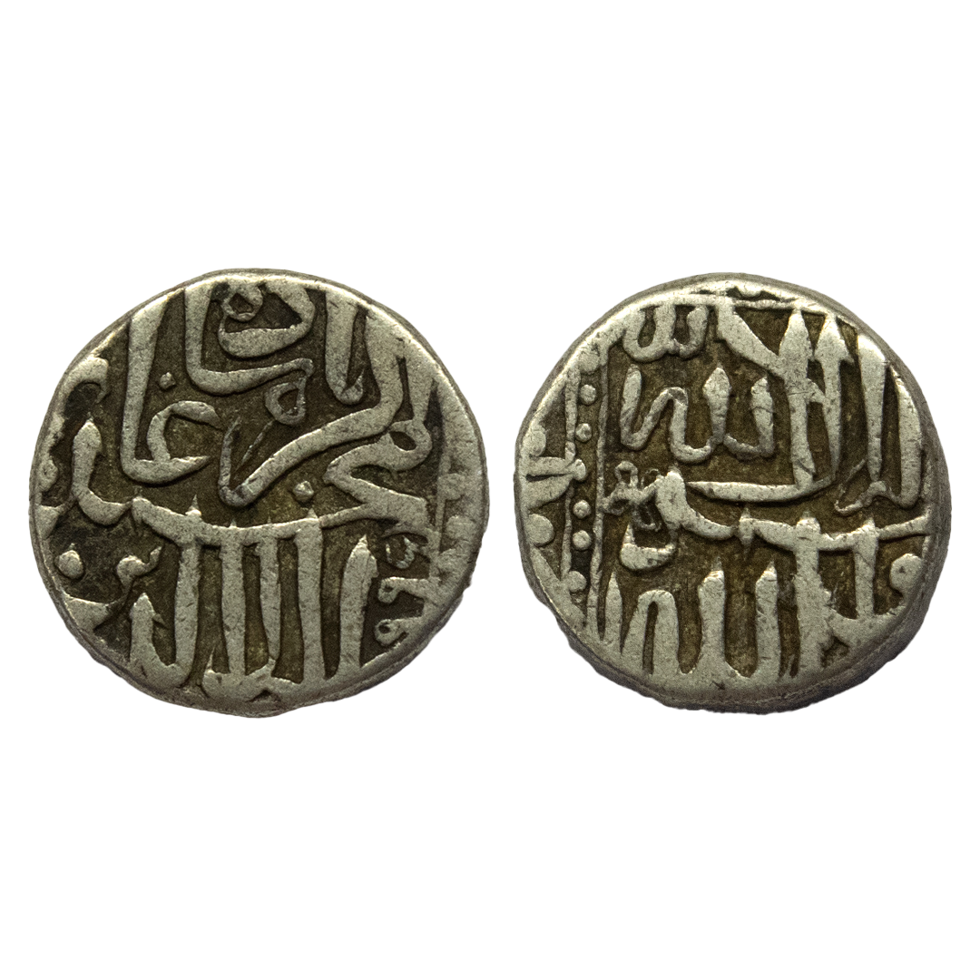 Akbar (AH 963-1014 / 1556-1605 AD), Silver Mahmudi, 5.64Grms, Mulher Mint, AH 1026, with a peacock feather symbol on rev., Mahmudi's struck by the Raja of Baglana at Mulher. (KM # 72.1).