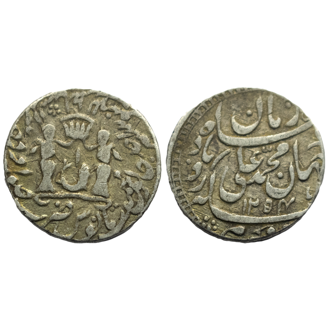 Awadh, Shuja'-ud-Daula, (AH1167-1188 / 1754-1775 AD), Silver Rupee, Muhammadabad Banaras Mint, RY 5, in the name of Shah Alam II, like a comb symbol on rev. (KM # 36.4).