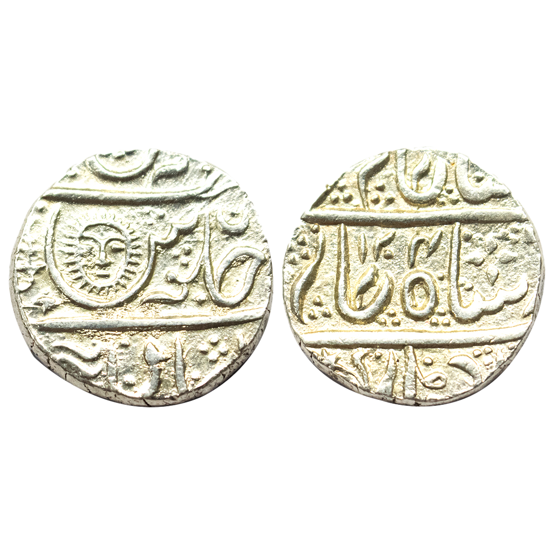 Indore, Silver ½ Rupee, 5.50Grms, Malharnagar Mint, in the name of Shah Alam II, sun face on julus seen on obv. (KM # 73).