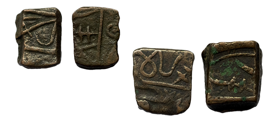 Sunth, Anonymous issue, Copper Paisa (2 coins), Obv: Nagari Shri in retrograde with katar symbol, Rev: Katar symbol. (Panchal # 313).