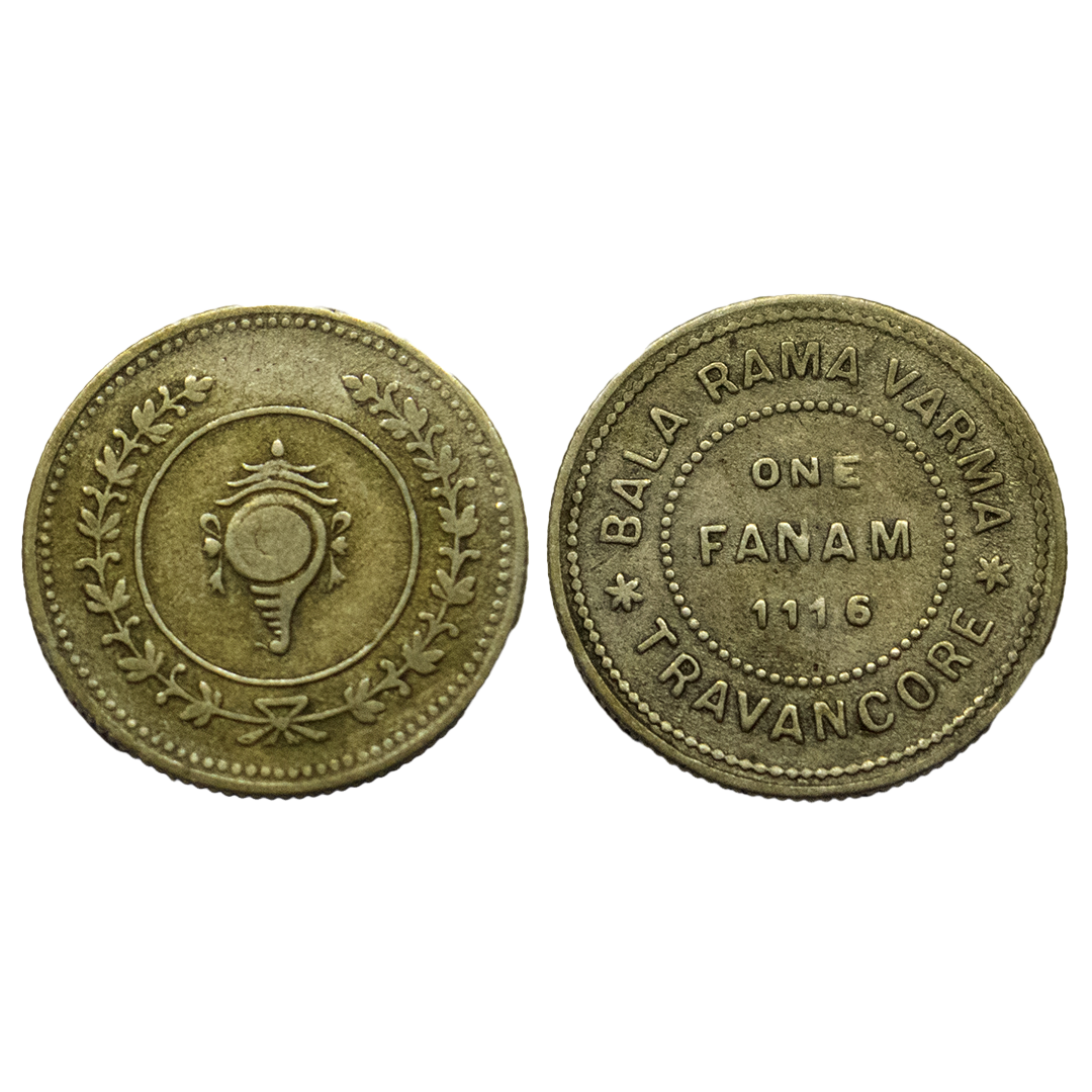 Travancore, Bala Rama Varma II (ME 1101-1126 / 1924-1949 AD), Copper 1 Chuckram, 7.69Grms, Obv: Bust of Bala Rama Varma II facing to right side, Rev: Conch shell within sprays and in margine value and state name. (KM # 60).