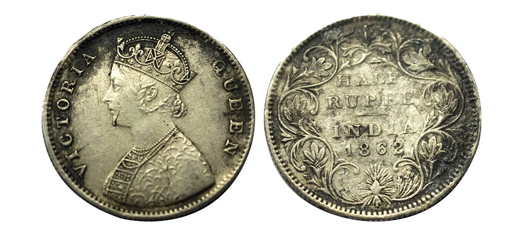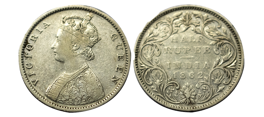 British India, Victoria Queen, 1862, Silver ½ Rupee, Bombay Mint, Elongated Beads on both the Arches of the Crown, Obv B1/ Rev II, Pr. 258-A-Variety.
