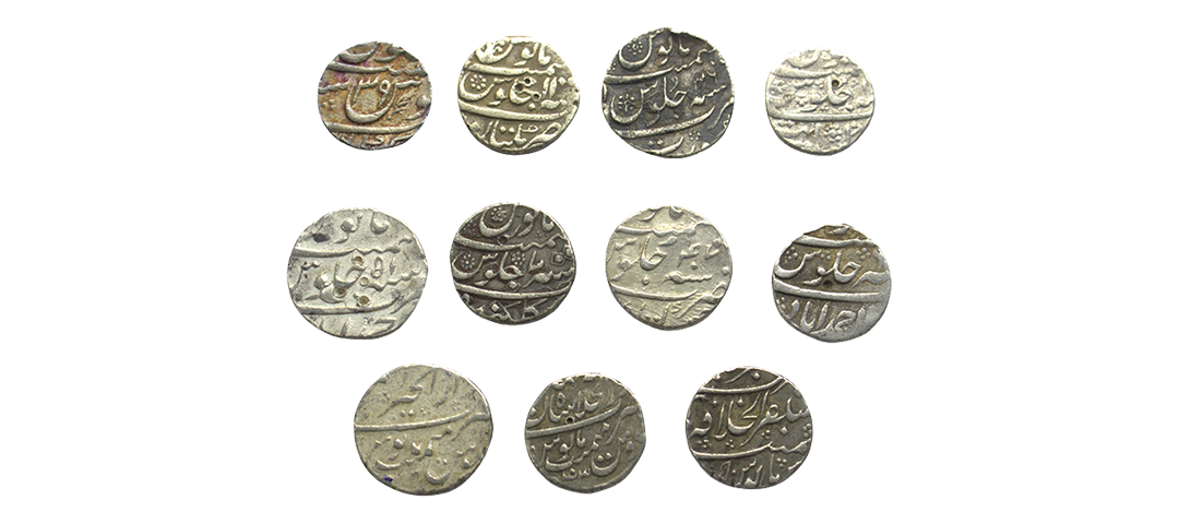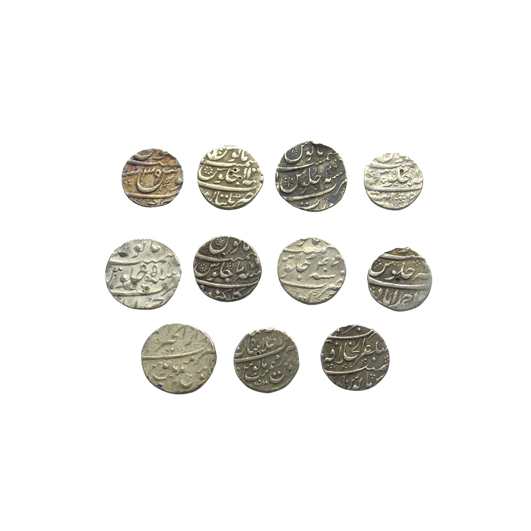 Aurangzeb Silver Mix Rupees Lots (11) Mint ( Akbarnagar , Katak , Multan , Surat , khambayat , Golkunda , Ahmedabad , Darul Khair Ajmer, Darul Khilafat shahjahanabad , Mustaqir al Khilafat Akbarabad