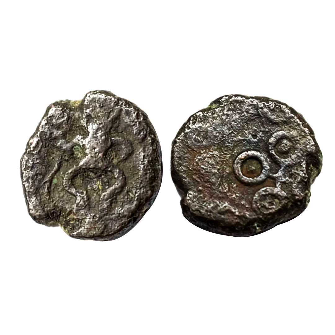 Ancient, Ujjaini (c. 2nd century BC), Copper Unit, Bull Type, Obv: Bull to right, swastika above, tree in railing, Rev Ujjain Symbol with dots in orbs, Similar to piper 343,3.84g Fine.