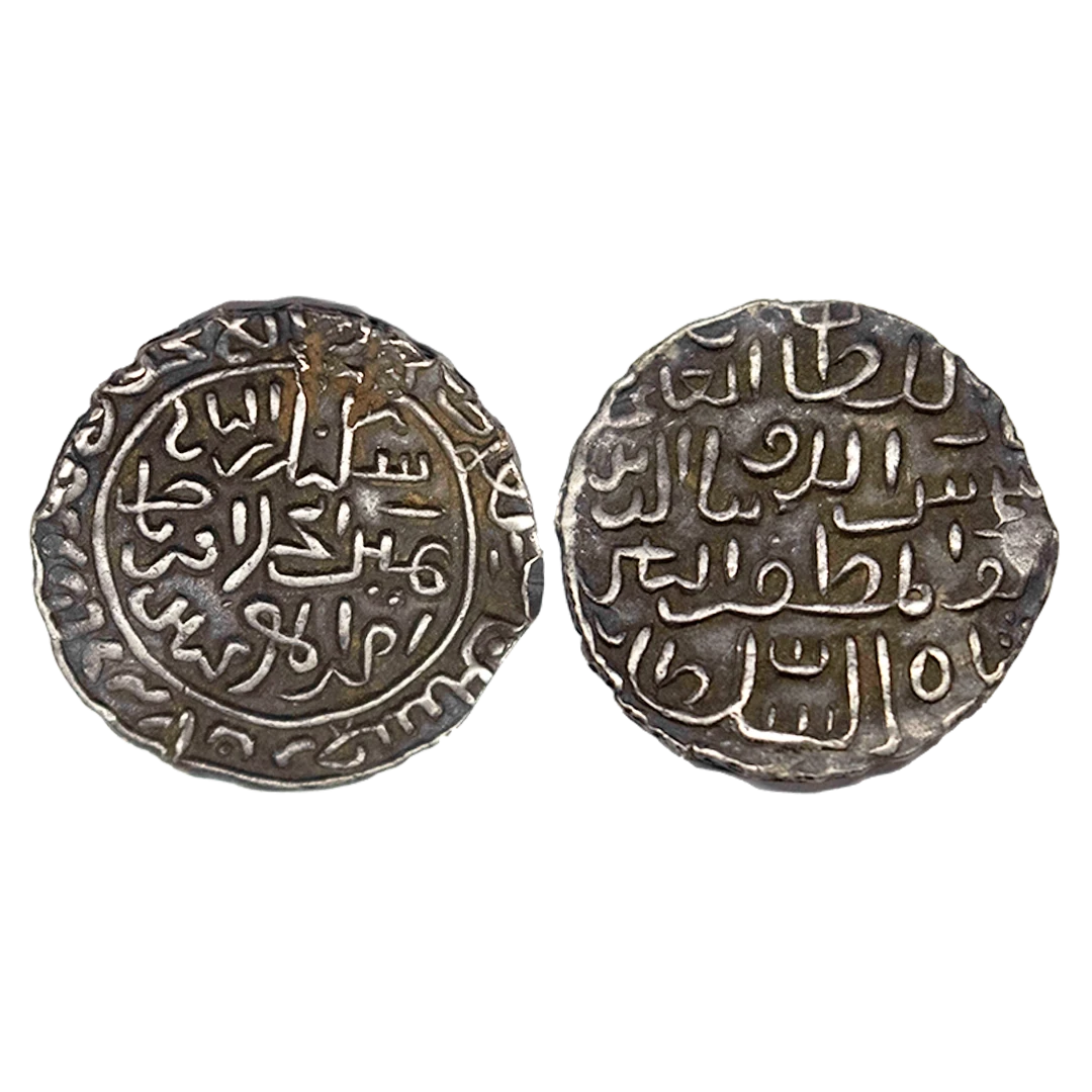 Sultans of Delhi, Suris, silver rupee of Muhammad Adil Shah (1552-1546 AD), Mintless Type, 961 AH Complete Date Visible, G&G D1105, 11.03g. Obv: Arabic legend sultan muhammad adil khallada allah mulkhau wa sultanahu a'la amrahu, Devanagari legend below & date in right margin. Rev: Shahada and name of 4 caliphs. About Extremely fine, Rare.