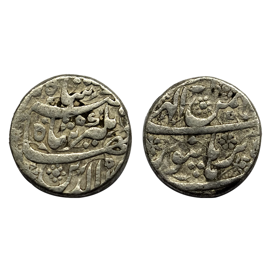 Jahangir (1605-1627 AD), silver rupee, Ahmadabad mint, 'Inayat' couplet, AH 1030/RY 16, (Retrograde) decorative field on both sides, KM 149.4, Weights 11.39g. Extremely fine, Very scarce.