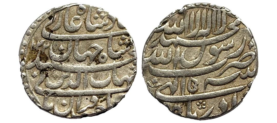 Shah Jahan (1628-1658 AD), silver rupee, Patna mint, Azar, 1042/RY 5, Weights 11.36g. Obv: Persian legend saheb-e-qiran sani shihab-ud-din muhammad shahjahan badshah ghazi in four lines. Rev: Kalima, date, month and mint name in four lines.