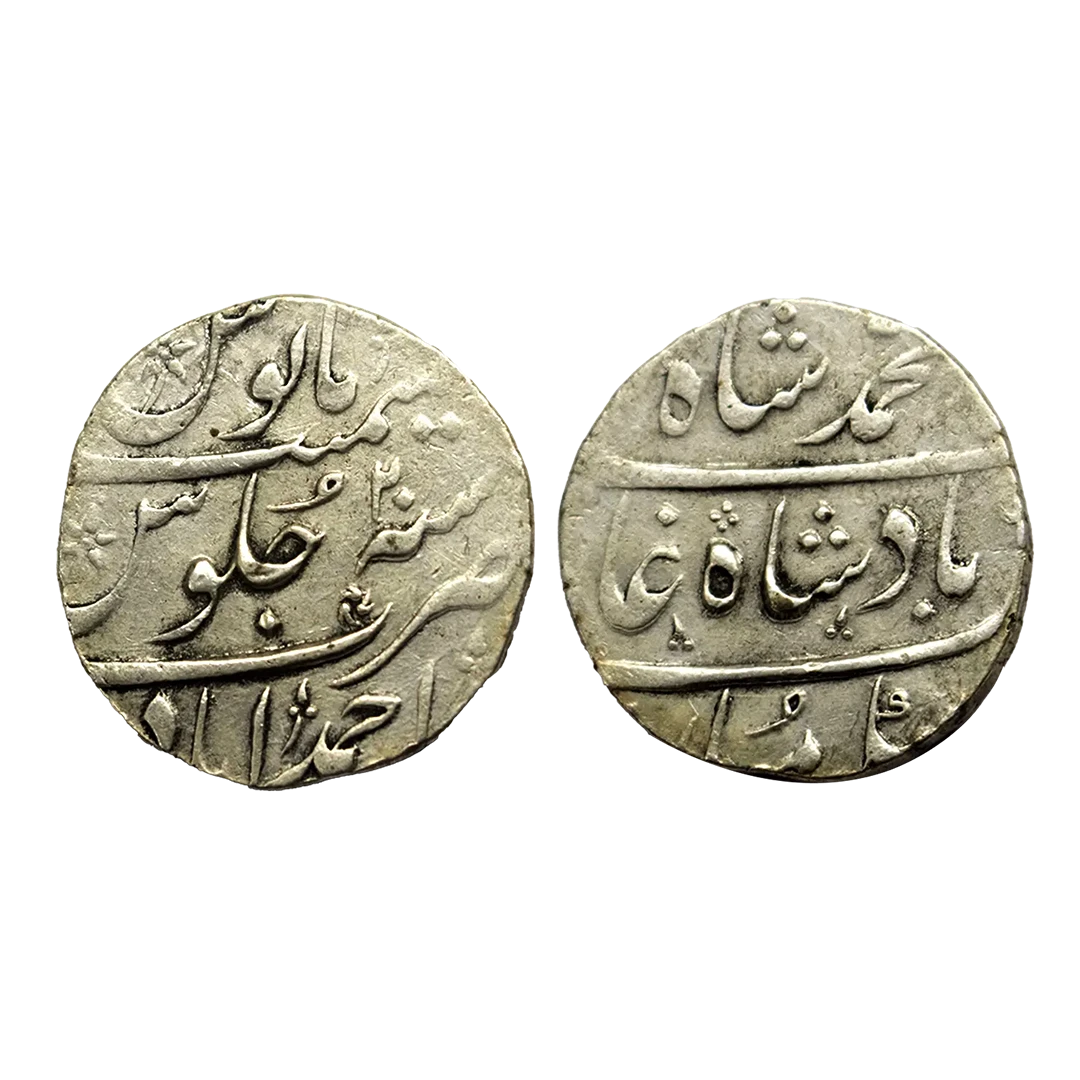 Muhammad Shah (1719-1748 AD), silver rupee, Ahmadabad mint, AH 115x/RY 21, KM 436.1, 11.52g. Extremely fine, Very scarce.