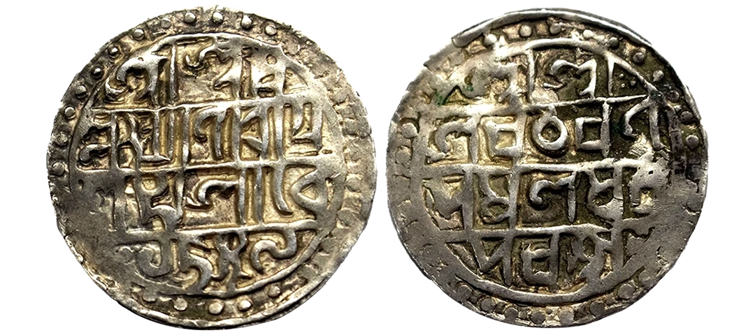 Cooch Behar, Lakshmi Narayan (1587-1627 AD), silver tanka, Sake 1509, Bose-KK.B2.1-2.40, Weights 9.98g. Obv: legend Sri Sri/Siva Charana/Kamala madhu/karasya in four lines. Rev: Legend Sri Srima/h, Naraya/nasya sake/1509 in four lines, both sides within circle and dotted border. Fine, Scarce.