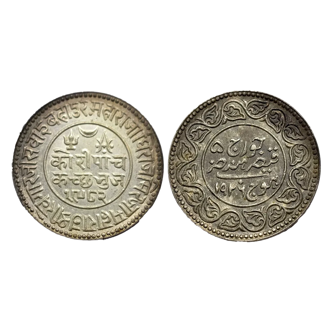 Kutch, Khengarji III (VS 1932-1998; 1875-1942 AD), Silver 5 Kori, with the name of George VI, VS 1982/1926 AD (KM Y53A). About Uncirculated.