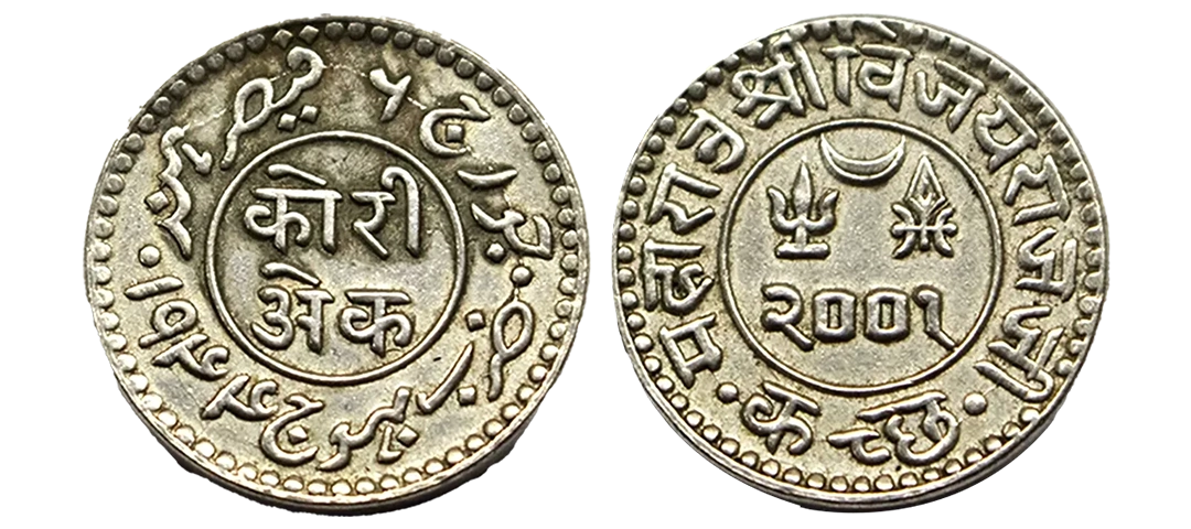 Kutch State, Vijayarajji, Bhuj Mint, Silver Kori, VS 2001/1944 AD, KM Y # 81, 4.68g, extra fine.