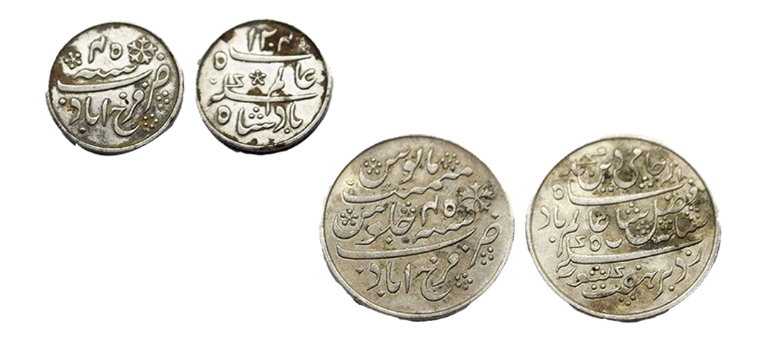 Bengal Presidency, Muhammadabad Banaras Mint, Silver 1/8 Rupee, 1.33, in the name of Shah Alam II, RY 49, sun-burst symbol on obv., Darogha mark on rev. (Stevens # 7.133). Extremely fine.