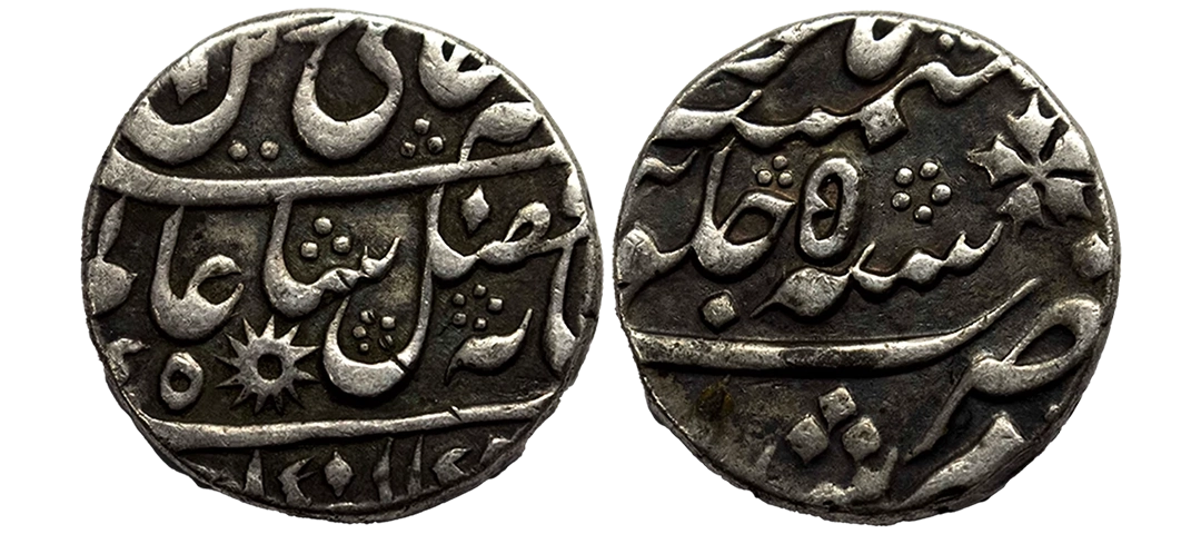 Bengal Presidency, Muhammadabad Banaras Mint, Silver 1/8 Rupee, 1.33, in the name of Shah Alam II, RY 49, sun-burst symbol on obv., Darogha mark on rev. (Stevens # 7.133). Extremely fine.