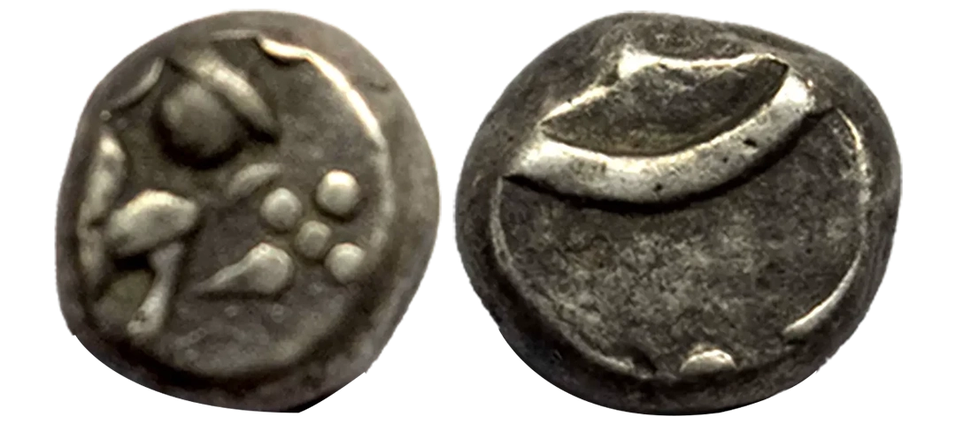 Madras Presidency (1764-1807 AD), Silver 2 Fanam, Obv: Standing diety Vishnu, Rev: Two interlinked C’s, 1.80g,fine, scarce.